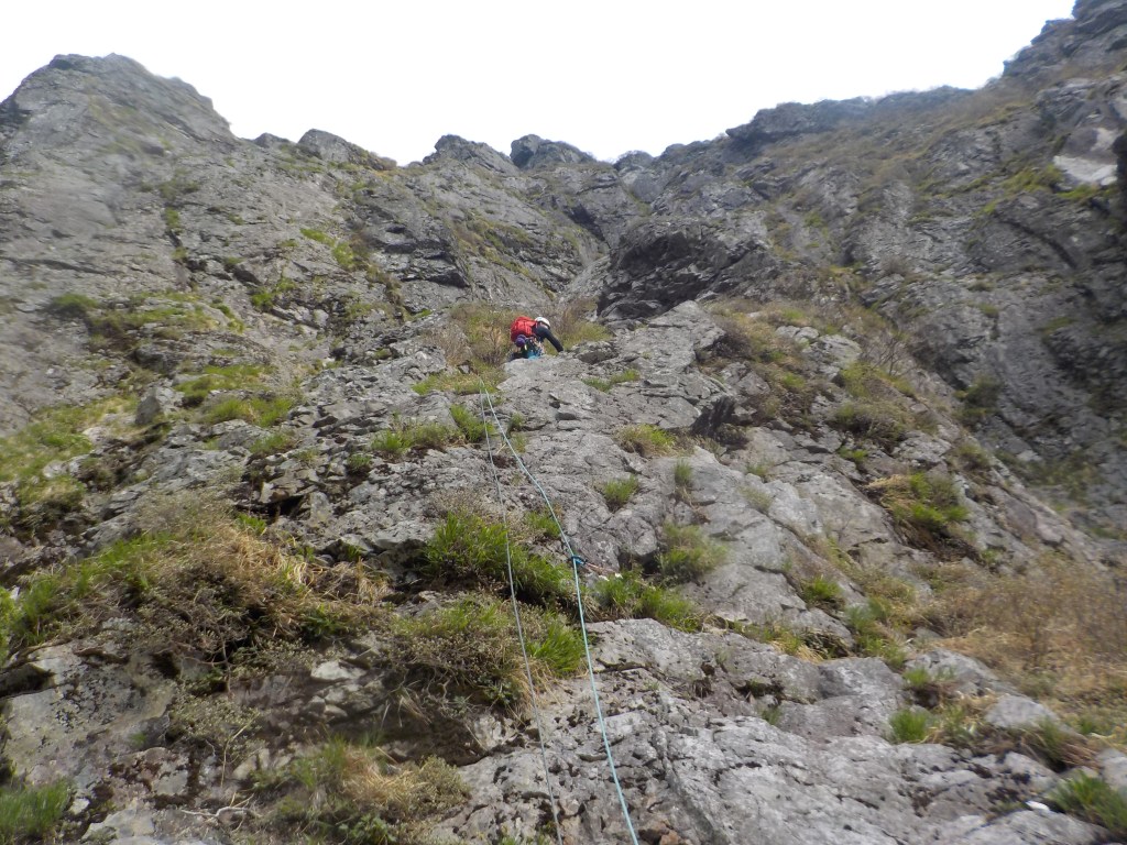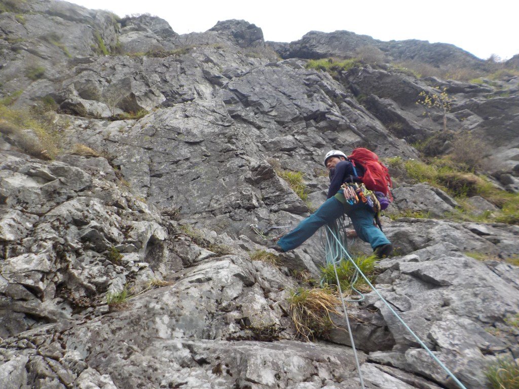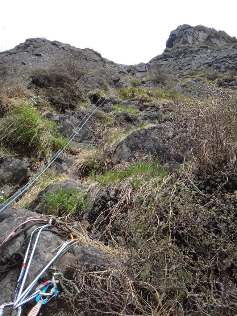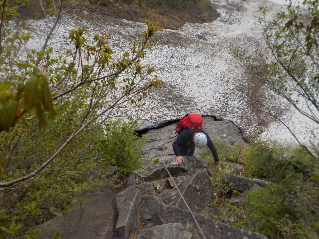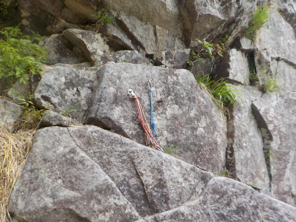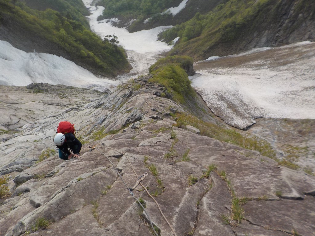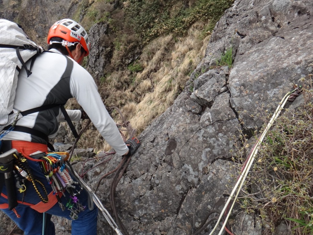 ・1ピッチ空中懸垂下降でダイレクトルートの凹角へ下りそのまま南稜上部の草付の方へ横断しながら下っていきました。(50mで残置スリングの掛かった残置支点のある所まで行けます。)残置支点の残置スリングでセルフをとり、そこでロープはいったん片付けて、熊笹を掴みながらフリーで南稜終了点まで下りました。