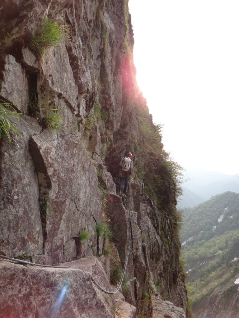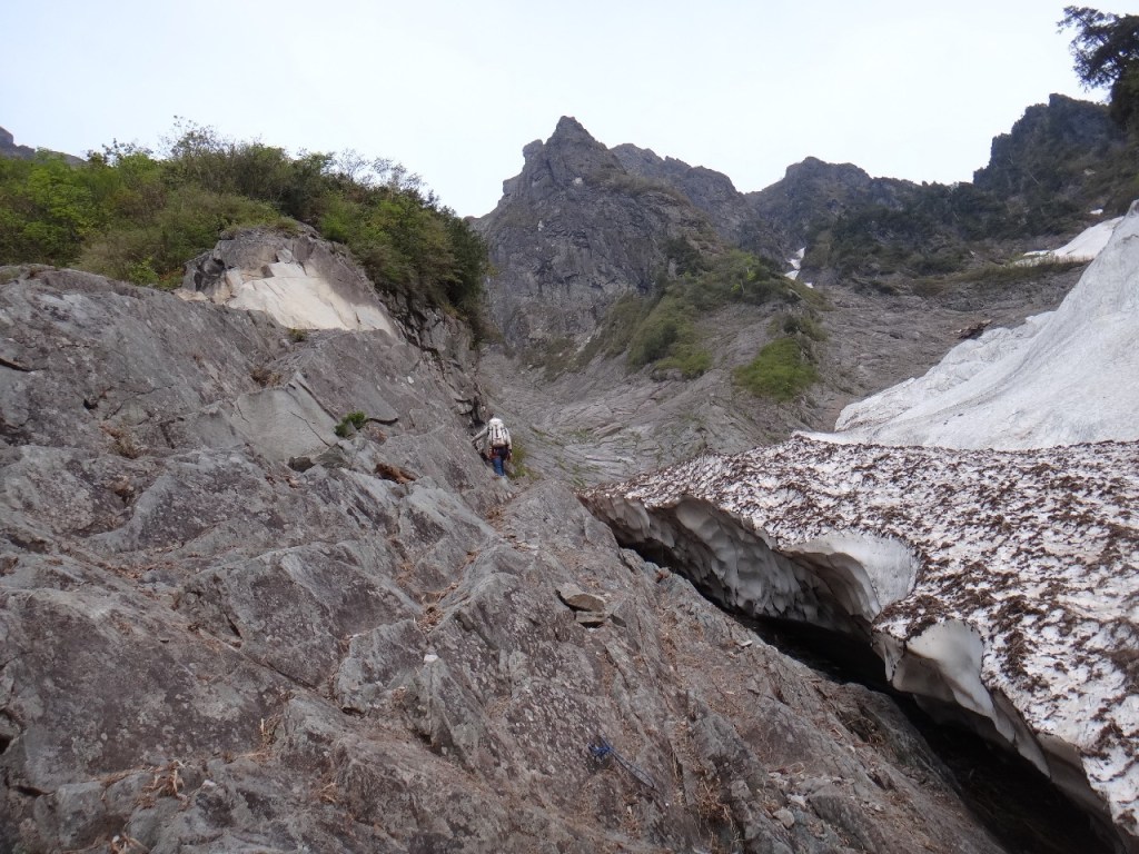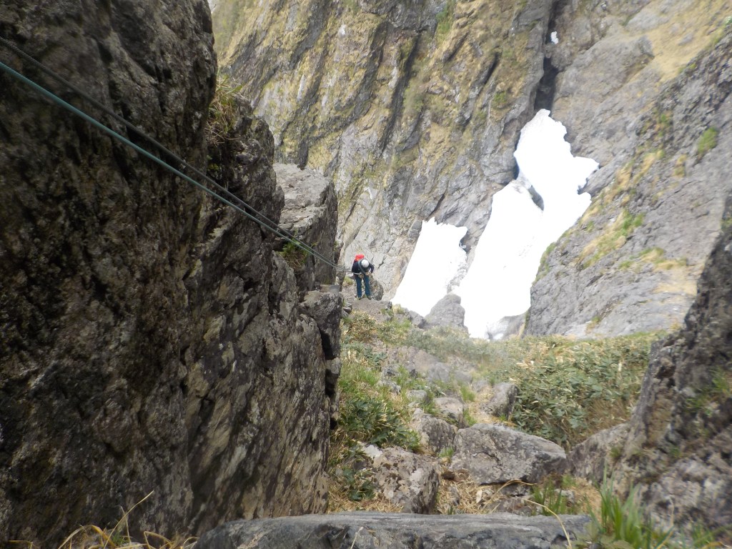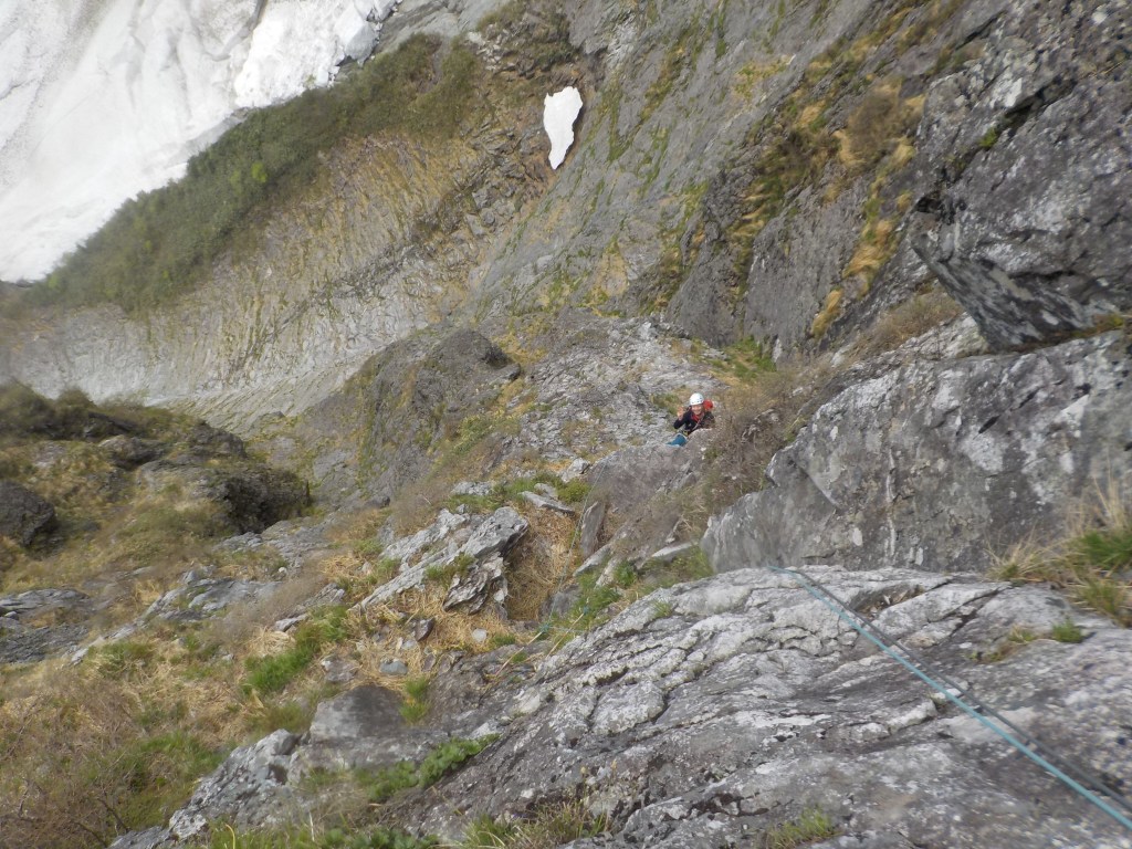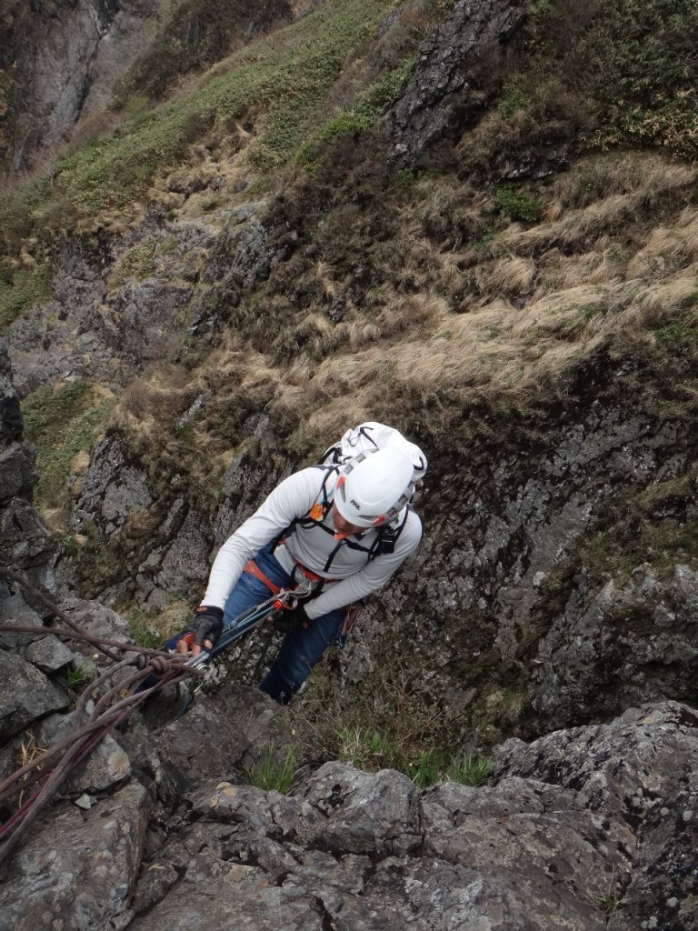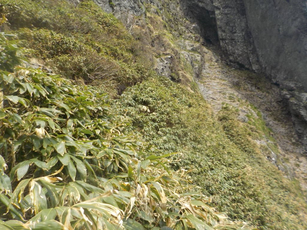 ・1ピッチ空中懸垂下降でダイレクトルートの凹角へ下りそのまま南稜上部の草付の方へ横断しながら下っていきました。(50mで残置スリングの掛かった残置支点のある所まで行けます。)残置支点の残置スリングでセルフをとり、そこでロープはいったん片付けて、熊笹を掴みながらフリーで南稜終了点まで下りました。