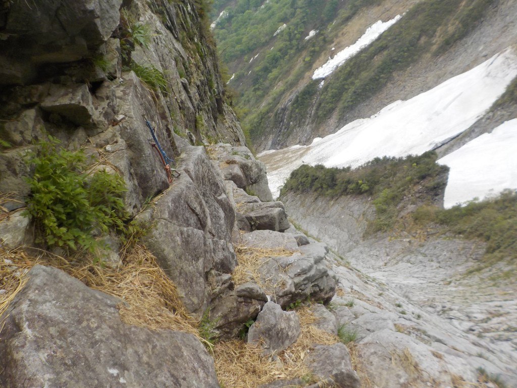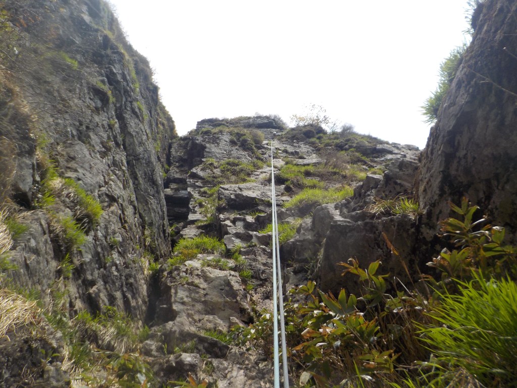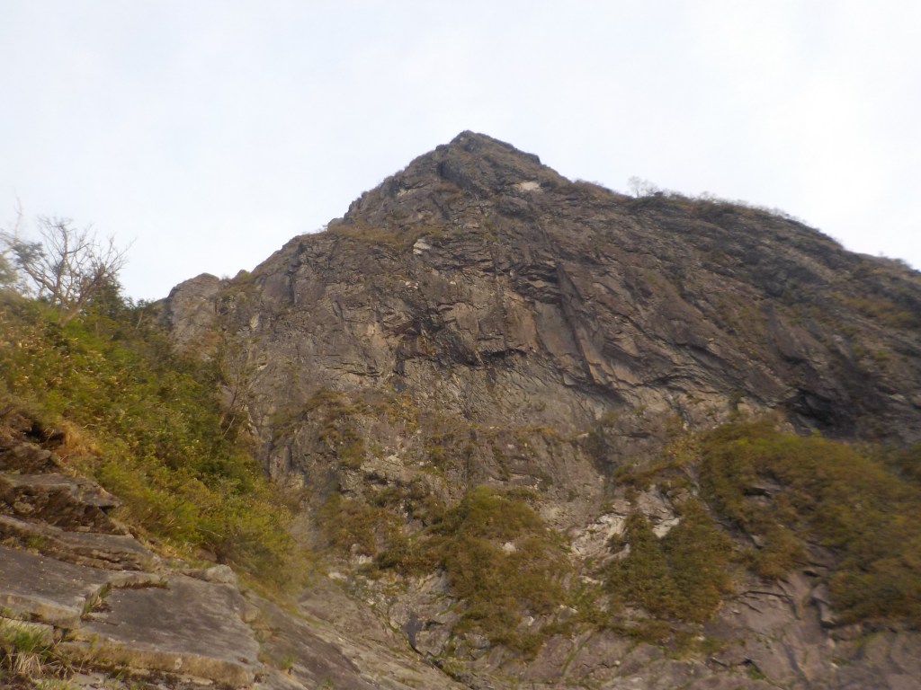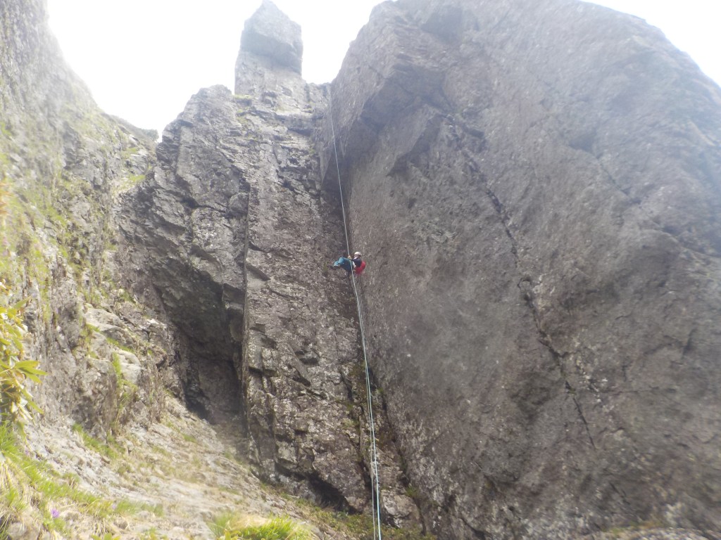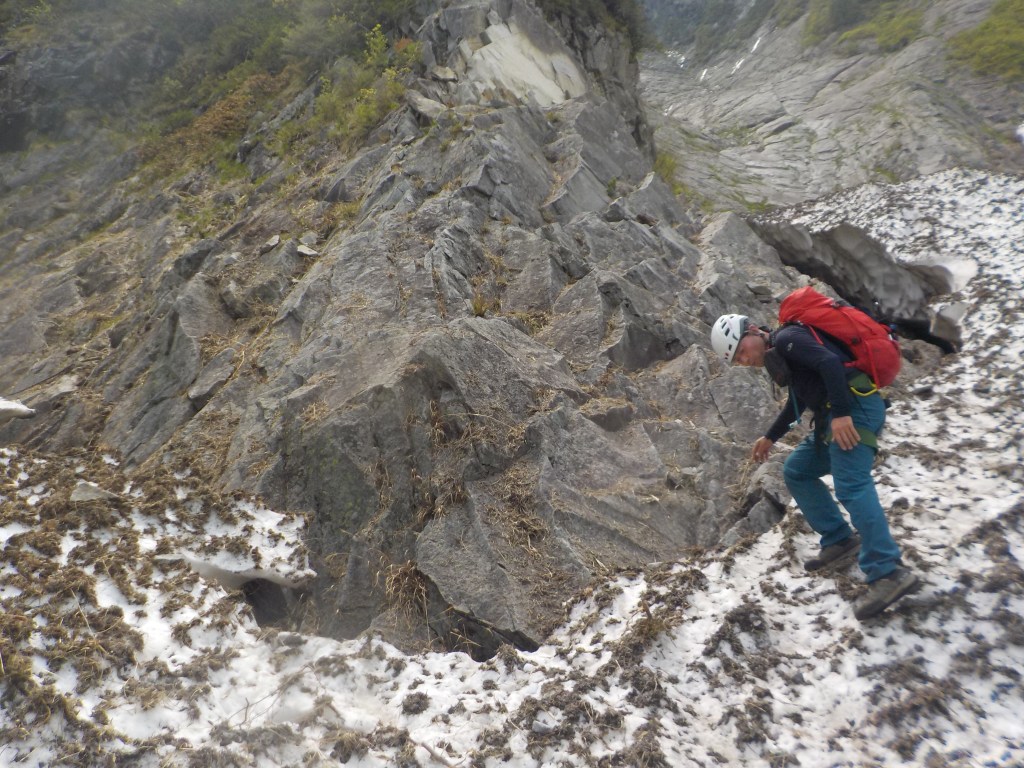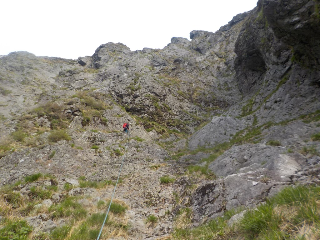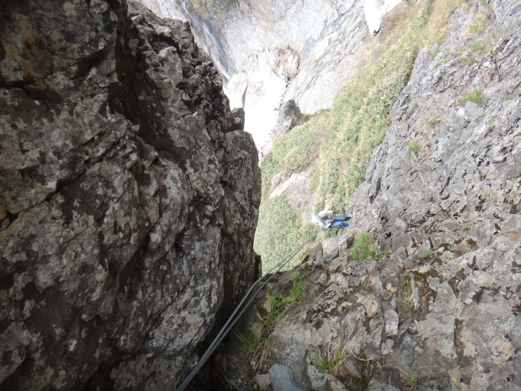 ・1ピッチ空中懸垂下降でダイレクトルートの凹角へ下りそのまま南稜上部の草付の方へ横断しながら下っていきました。(50mで残置スリングの掛かった残置支点のある所まで行けます。)残置支点の残置スリングでセルフをとり、そこでロープはいったん片付けて、熊笹を掴みながらフリーで南稜終了点まで下りました。
