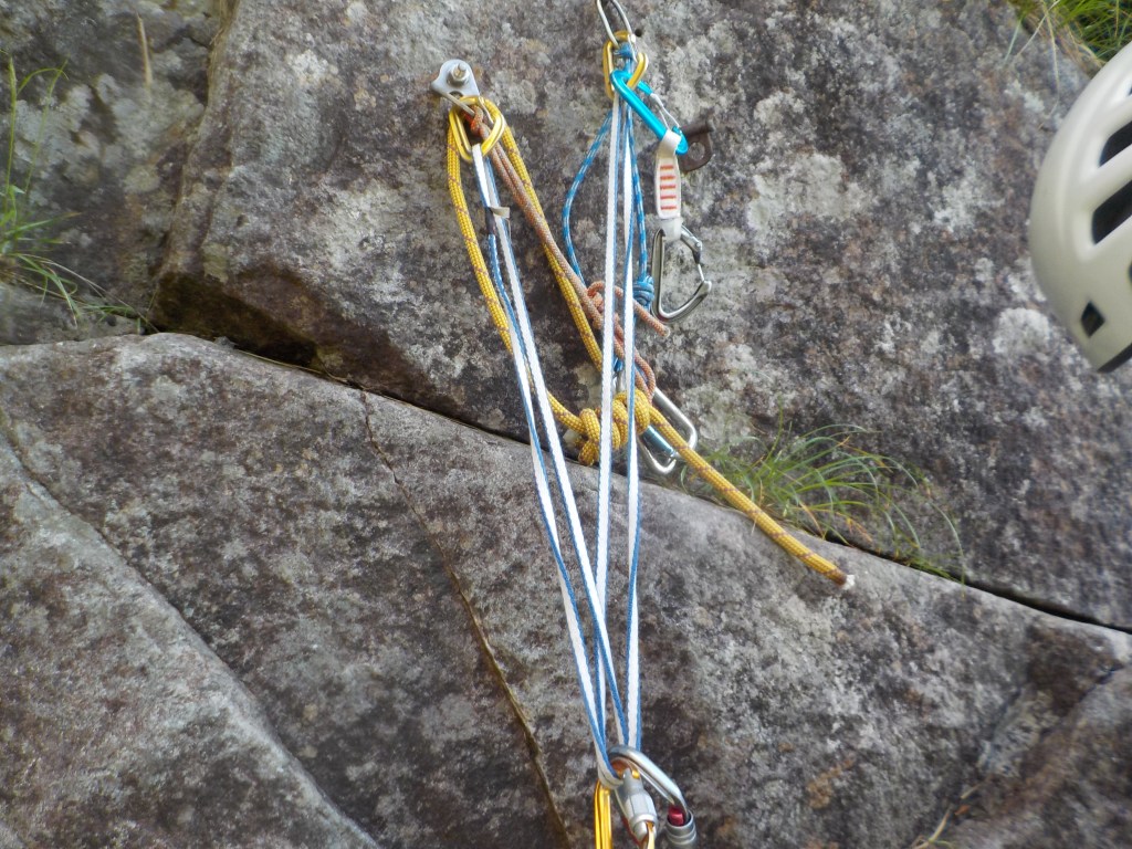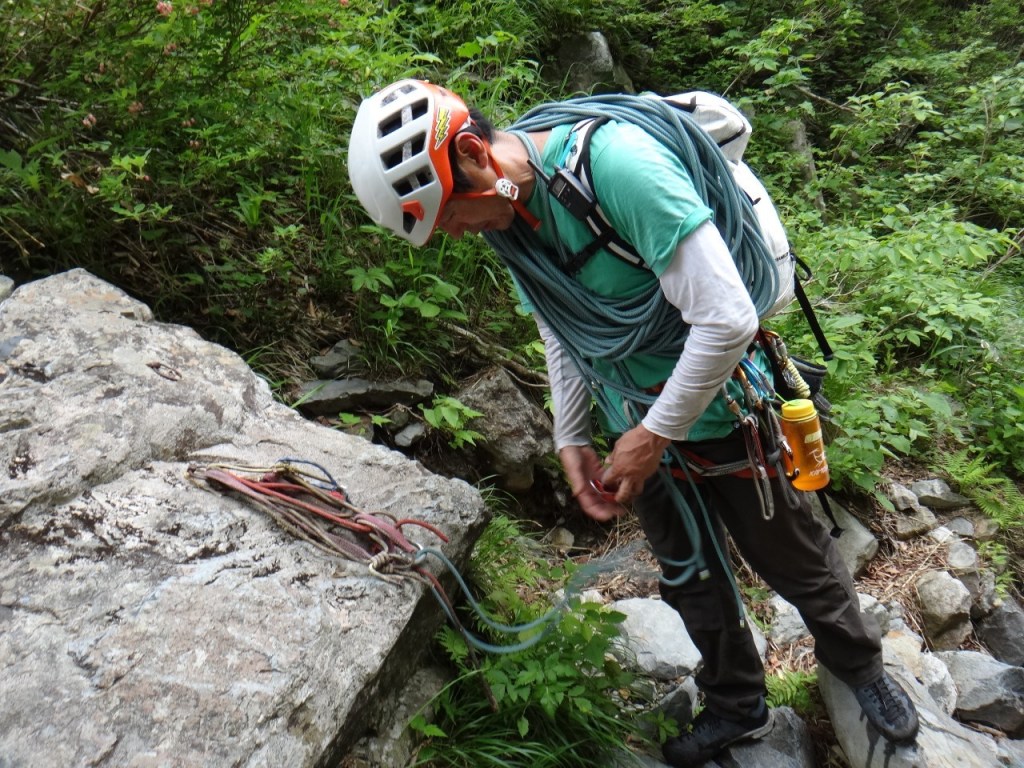⑤木の残置スリング&カラビナ、50m(40m+10m)、若干の空中懸垂があるが問題なし。