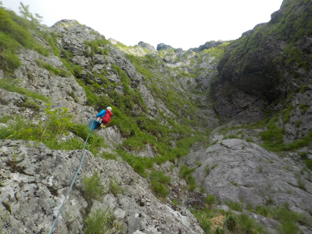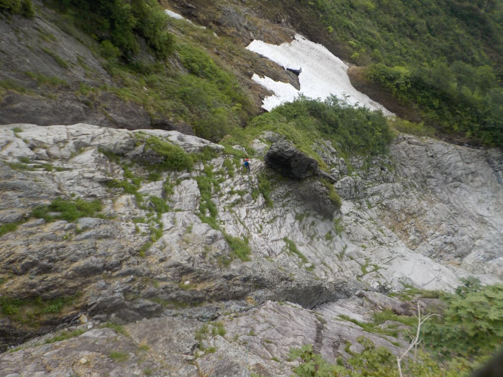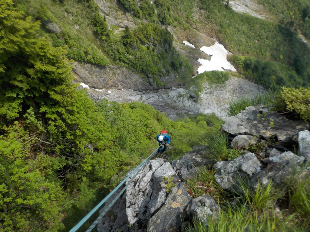 ・トポでは3回目の懸垂下降以後は懸垂下降したあとに右下にある次の懸垂下降支点まで移動してまたそこから懸垂下降をするという感じの図になっていましたが、次の懸垂下降支点までめいいっぱい懸垂下降し、フリーで下る状況を作りませんでした。