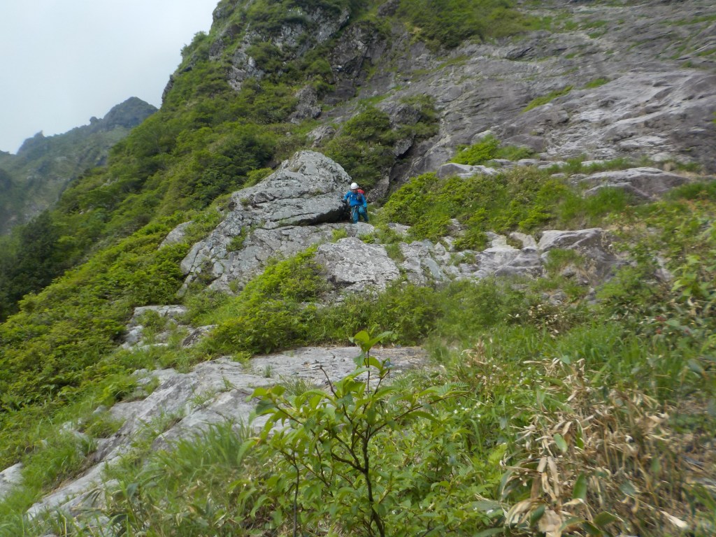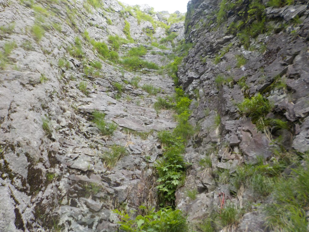 ・草付の階段状へ豪快に乗越そうとクラック上部の岩を掴んで荷重したら胴体ぐらいの岩が動いたのでそっと登りました・・・。
