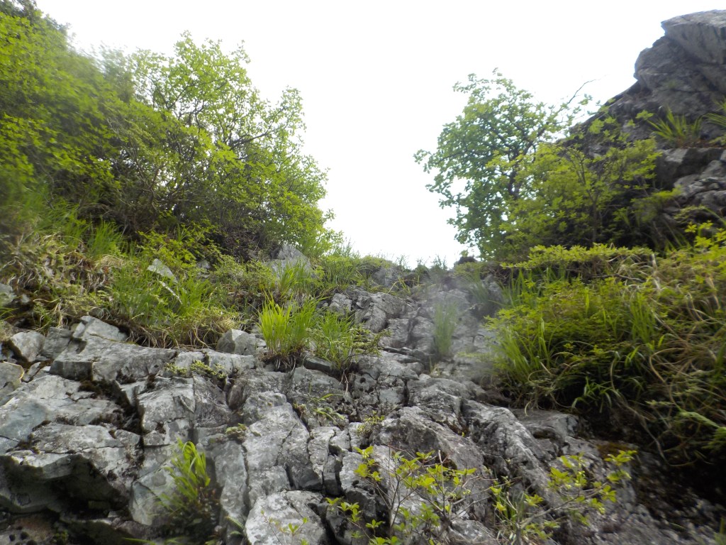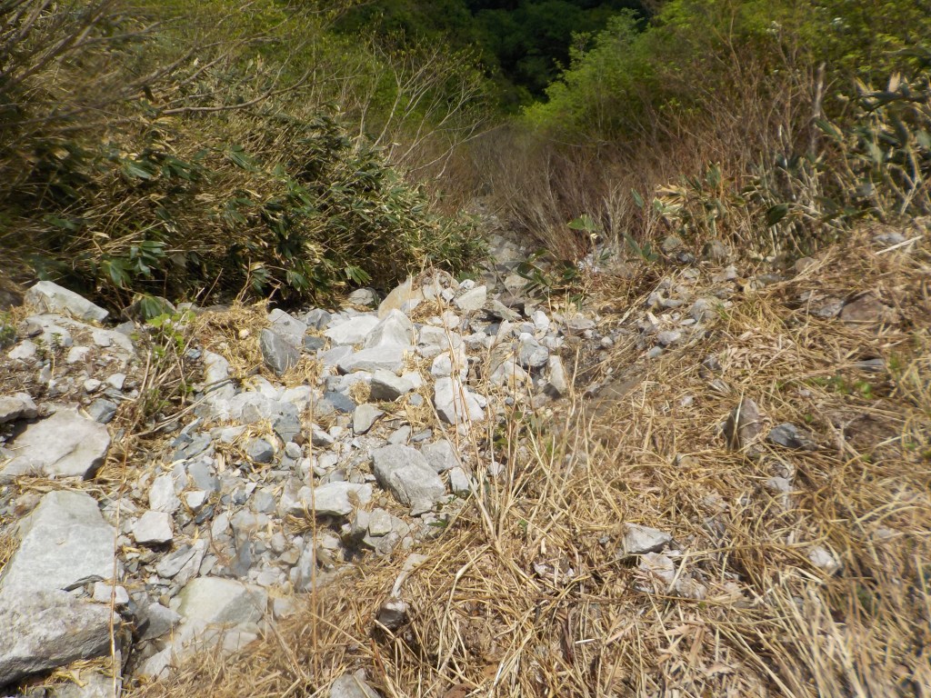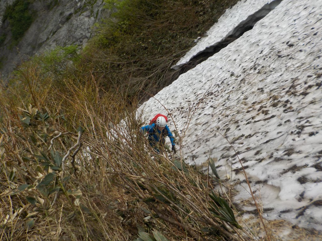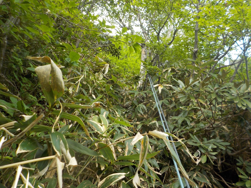 ③リングボルトとハーケン、50m(40m+10m)でぎり、笹薮がひどくなる。スタックに注意!!