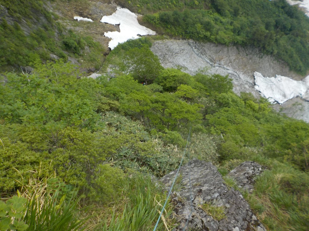 ④木の残置スリング&カラビナ、40m(20m+20m)、だいぶ右の方向へ下るのでロープが屈曲します。先行者は懸垂下降終了したらロープが引けるか確認を忘れずに!!また、スタックにも注意!!(この区間、下り始めてから5mぐらいのところにも懸垂下降支点がありますがそこはスルーしました。そこでピッチを切っても右へ右へと更に屈曲するのでここでピッチを切ってもスタック対策になるのかなー?)トポのとおり20m真っすぐ下ってから残りの右へ右へと下る区間をフリーで下ることもできないことはないと思いますが(フリー区間は灌木を掴みながらクライムダウンできそうではあるが・・・)落ちたら終わりなのでフリーはおすすめしません!