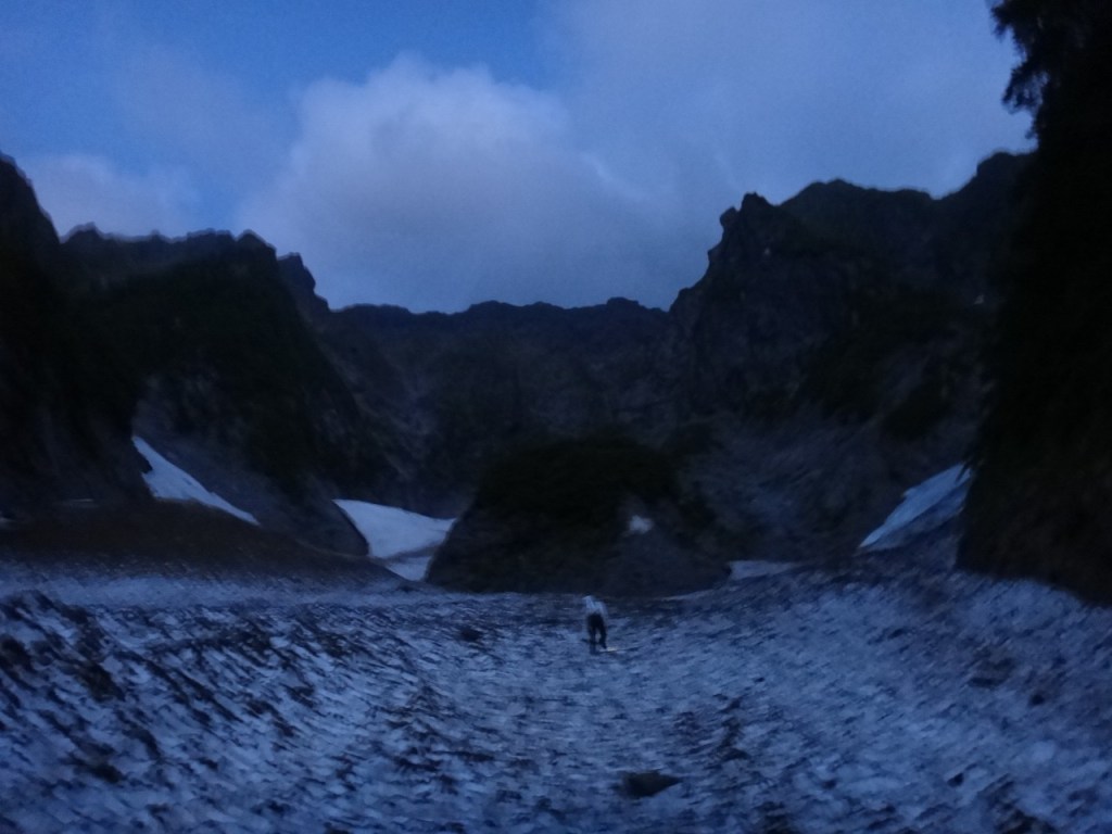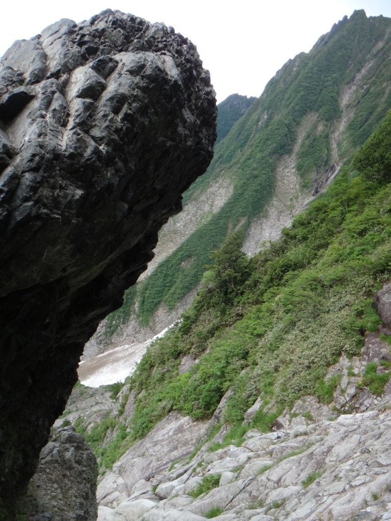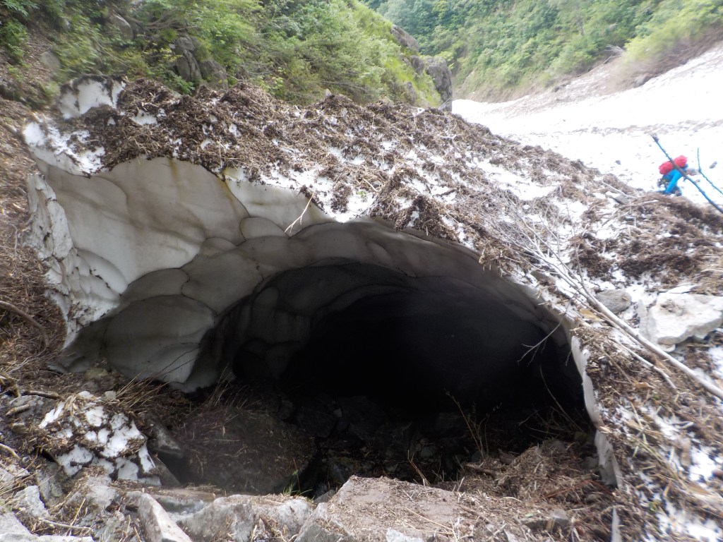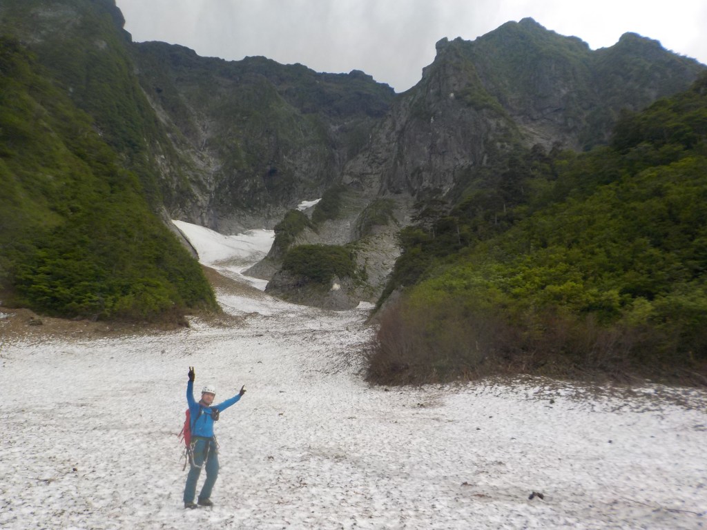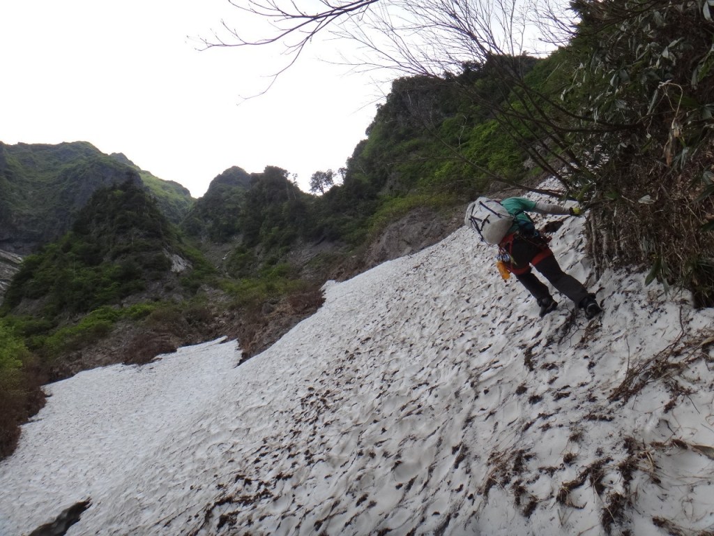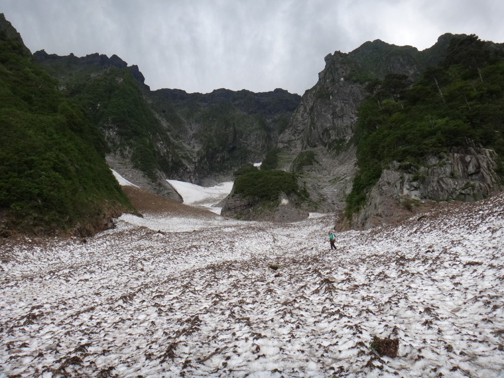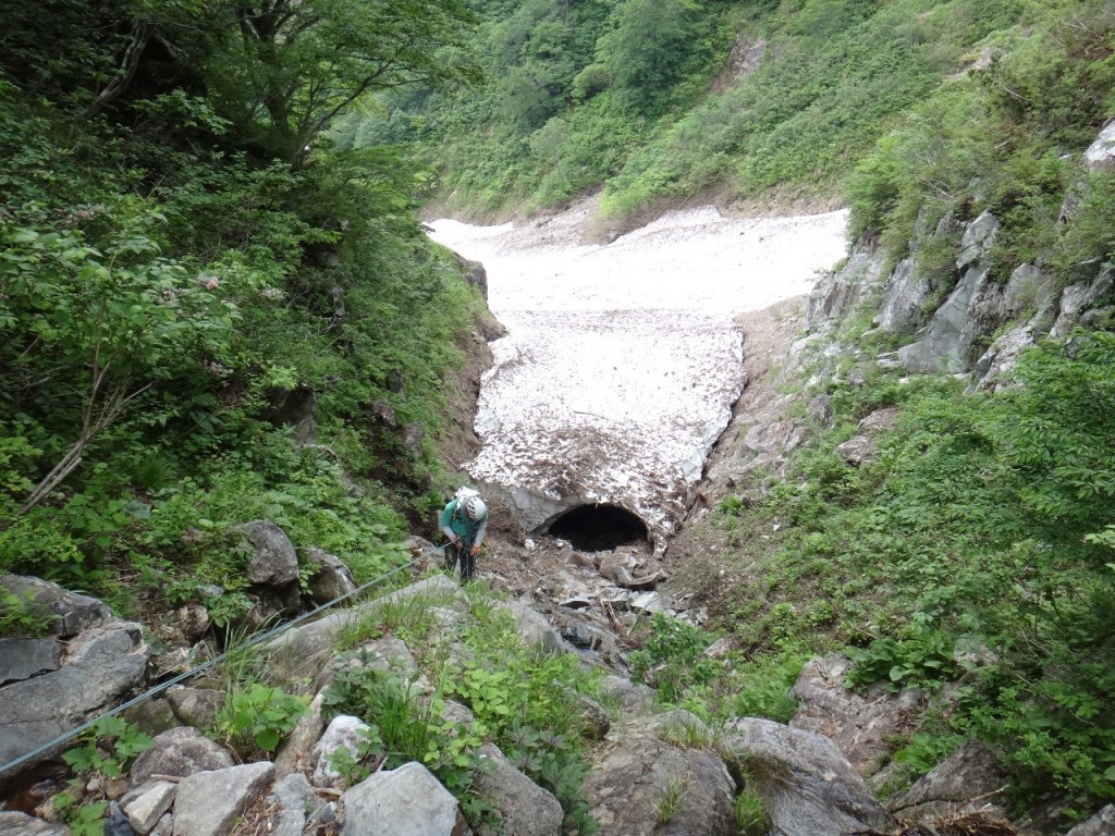 ・衝立前沢のスノーブリッジ状になっている雪渓へは右端から乗りました。まだまだ崩れそうになさそうでしたが状況判断に注意が必要です。