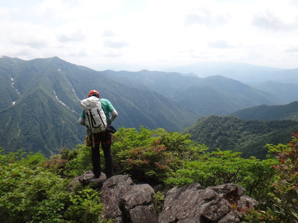 (山宮)6/19(日)は山岳会山行で布岩の予定でしたが日曜日の天気予報がいまいちだったので前日の6/18(土)に日程が変更になりました。予報の悪い日曜日は『ジムか?レストか?それとも里山で歩荷トレか?』と思ってましたが、金曜日に天気予報を見ると日曜日も何とかなりそうな予報に変わっていたので急遽、進藤みさんを誘って凹状岩壁へ行くことにしました。前回は5P目でリード石附さんのフォール負傷で敗退、前々回はテールリッジ途中で雨敗退でしたが、今回は問題なく上まで登れました。(進藤みさんにお願いして4~6Pと8Pをリードさせてもらいました。A0無くオールフリーで登れて良かったです。)6P目はルーファイに迷いました。スタートから少し上がってリッジへと右上してリッジを越えて凹角に入りバック&フットで高度を上げてからリッジの方へ戻ってリッジ沿いに登りその後凹角を登りました。残置支点を見るとおそらくリッジ上を登るのが正解のような気もしますが面白いムーブで登れて面白かったです!皆さんも是非(笑)8P目は岩が硬くて快適とのネット情報があったので草付の階段状へ豪快に乗越そうとクラック上部の岩を掴んで荷重したら胴体ぐらいの岩が動いたのでそっと登りました。お昼過ぎから雨予報の天気予報もあったせいか日曜日なのに他のパーティーは見かけませんでした。(3ルンゼに知人が入ってたと下山後に知りましたが。)反省点としては懸垂下降4回目でロープがスタックして少し登り返しました。(草付なので草を掴みながらフリーで。)この区間の懸垂下降は右へ右へと屈曲しながら下る懸垂下降で、木が倒れ木の根の部分がむき出しのところがあり、ロープが土付きの木の根に食い込んでロープスタックしてました。(昨年下りたときこんな状態の木は無かったと記憶してますが・・・)2番手の私が懸垂下降時にロープが木の根に干渉しないよう工夫して下りれば良かったのですが大丈夫だろうと(記憶ではそこまで右へ屈曲するとは思ってなかったのでロープスタックはしないだろうと思いました。)そのまま下降したのが悪かったと思います。