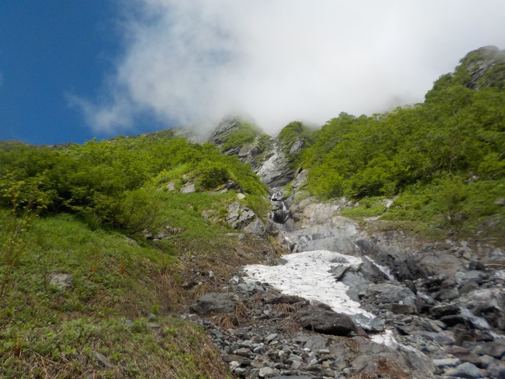(山宮)7/16~18の3連休は前穂四峰正面壁松高ルートに行く予定でしたが天気予報が悪く断念。天気が何とかもちそうな北岳バットレスに転進しましたが広河原からのアプローチが終わって下部岩壁で準備してこれから登ろうという時に雨に降られて敗退しました。(ある程度登ってからの雨なら難しいルートではないのでそのまま継続して登ったと思いますが、出だしから雨に降られて他メンバーのやる気が無くなったので止めました。)