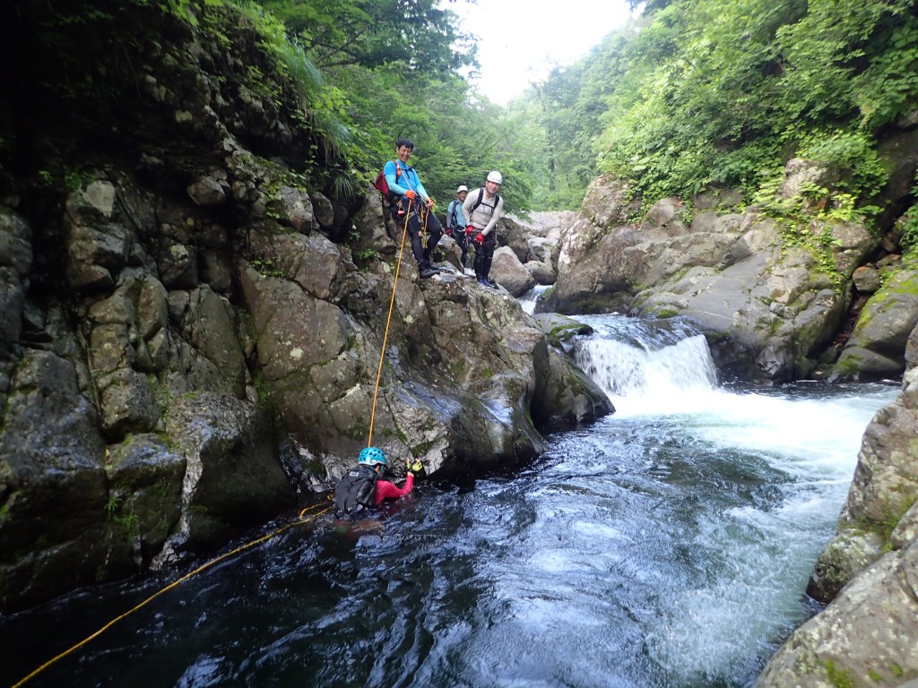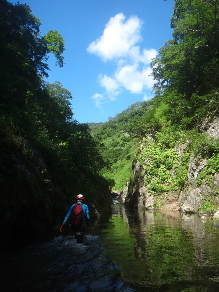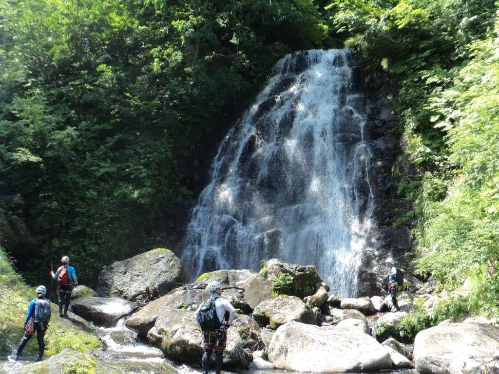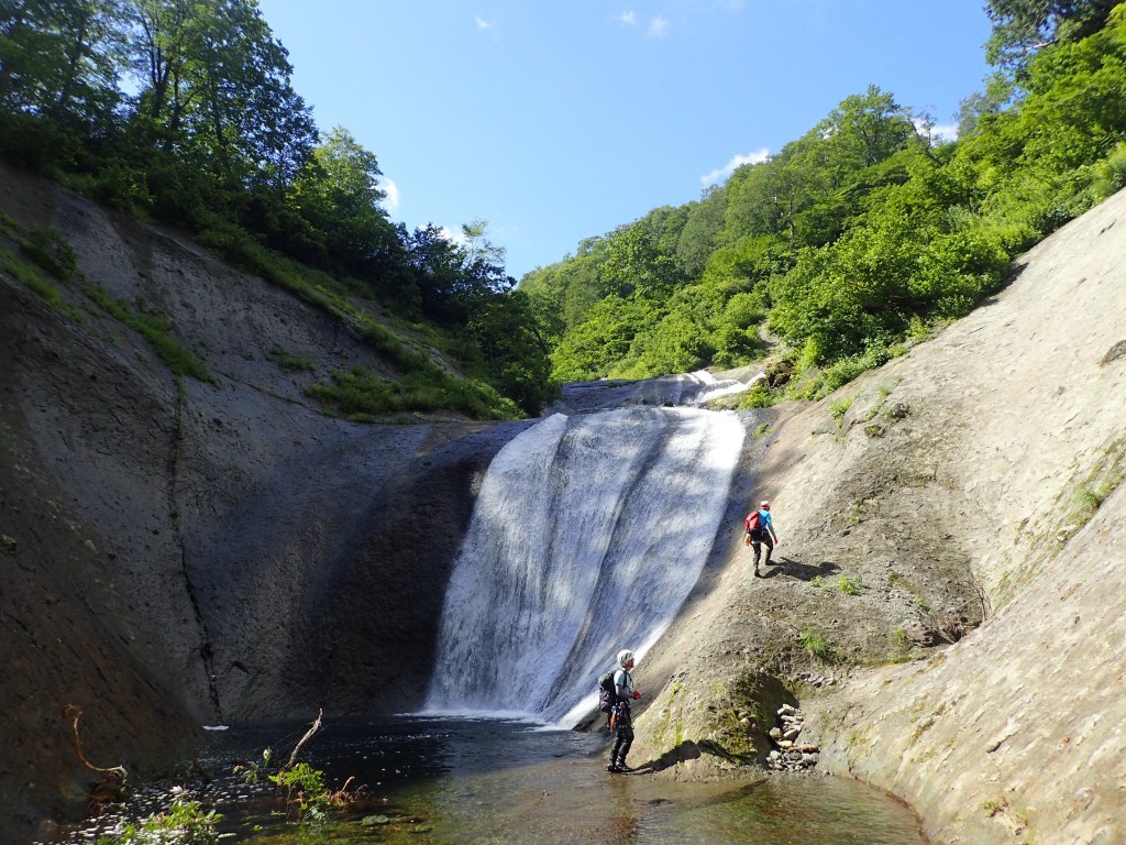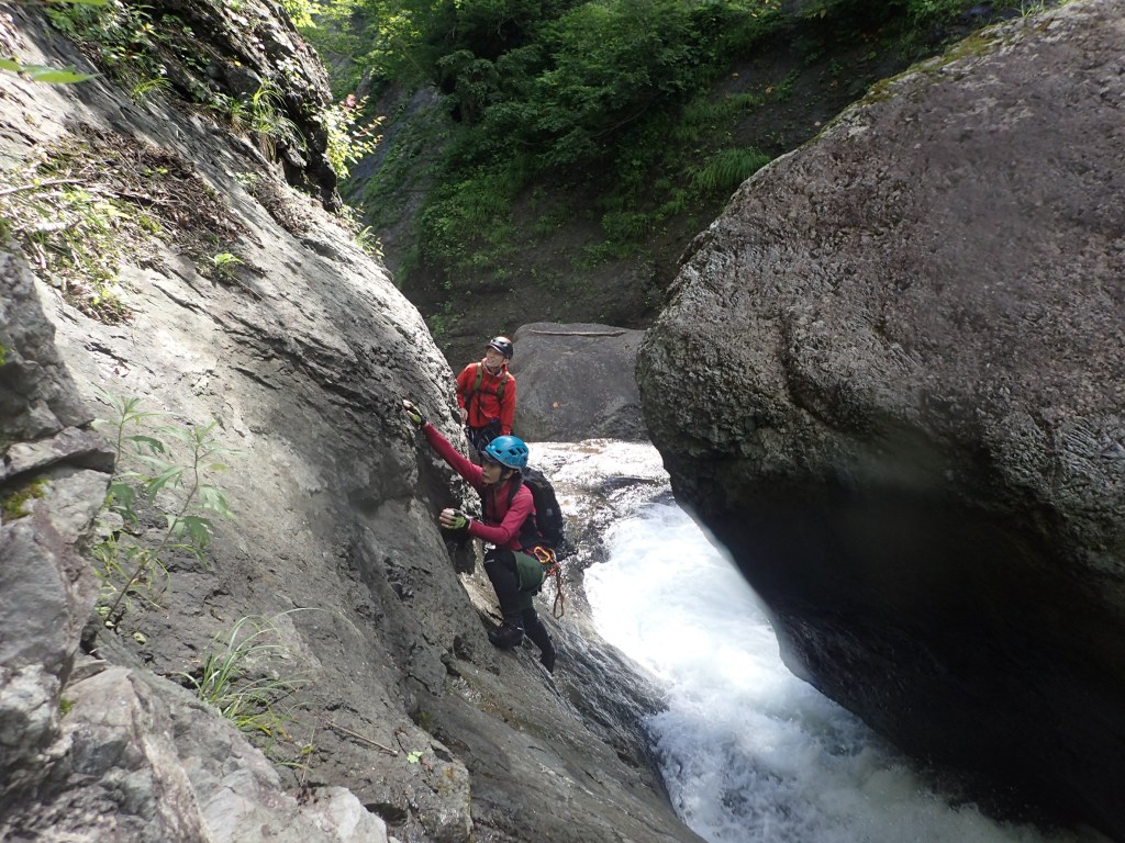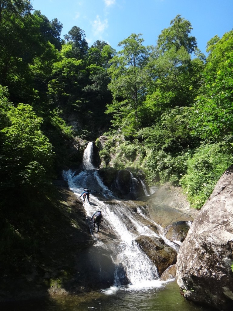 (神蔵)沢登りを始めてから3年目、初めての3級の沢。序盤の泳ぎが核心かなと思っていましたがフリーで登る滝と高巻きが一番緊張しました。軟弱なので際どい場面では躊躇なくお助けを要求!手厚いサポートのおかげでなんとか突破出来ましたが終盤までシビれる沢登りでした(付いて歩くだけのお客様ですが…)。弱音連発のわたしと違い淡々と進むまり子さんの姿と道中の励ましの言葉は心強く支えになりました。ハイライトの三ツ釜の滝は到着する頃には日差しもいっぱいでキラキラと感動の美しさ。沢日和で楽しい1日でした。メンバーの皆さま、ありがとうございました。