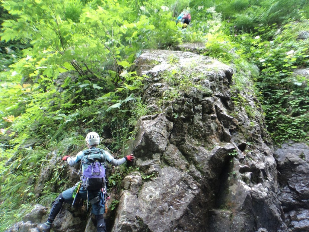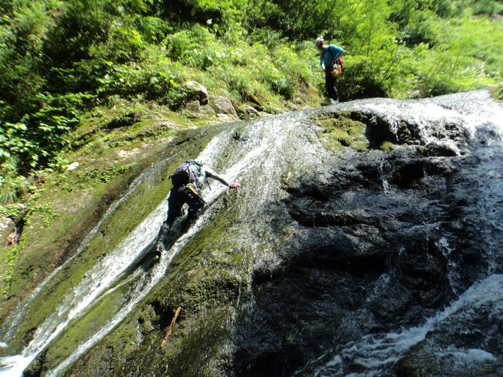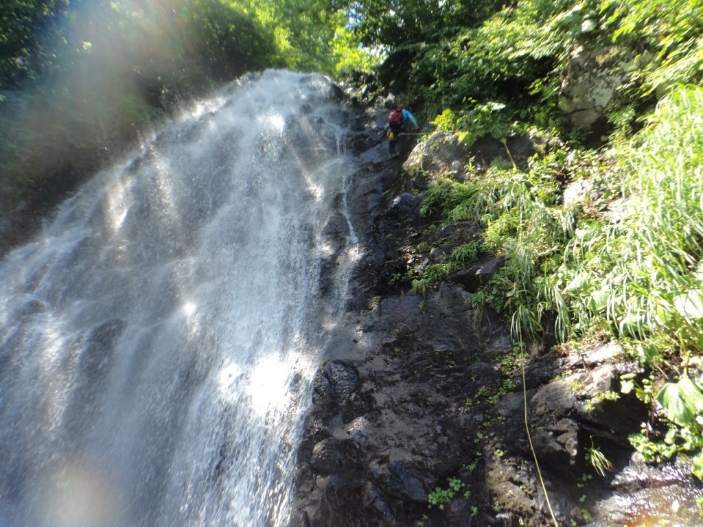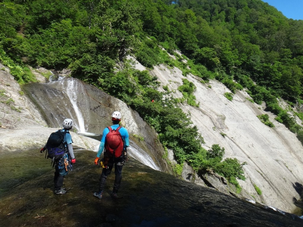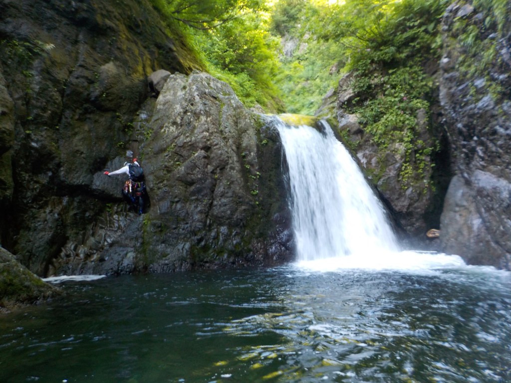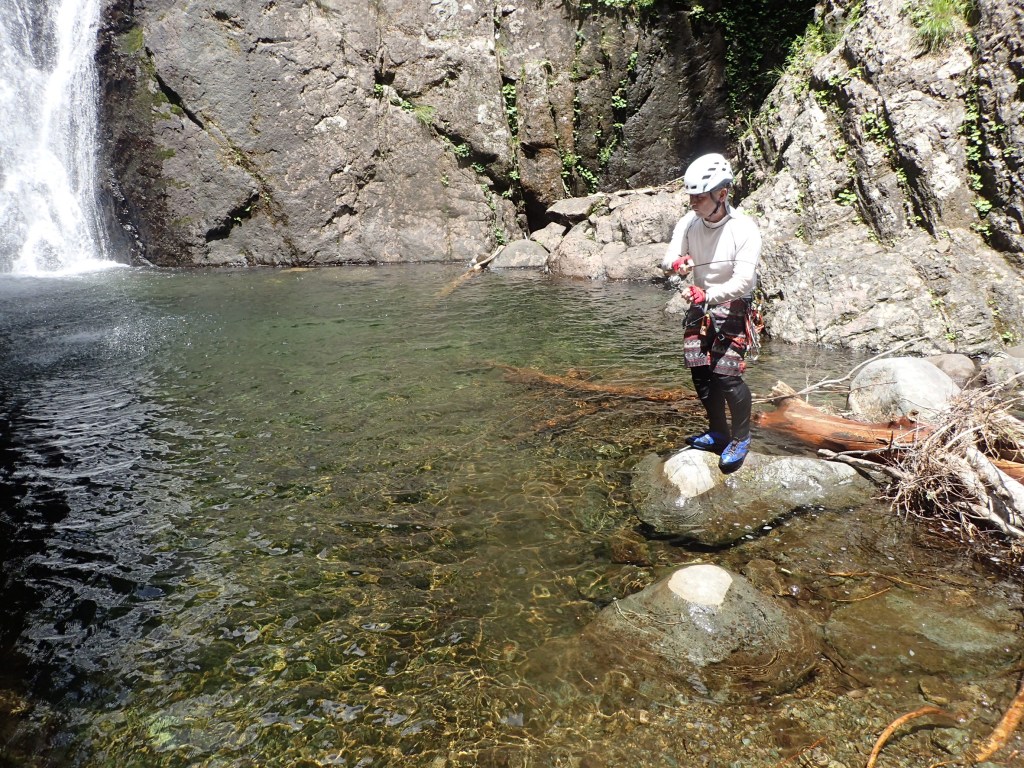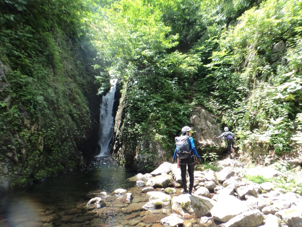 (神蔵)沢登りを始めてから3年目、初めての3級の沢。序盤の泳ぎが核心かなと思っていましたがフリーで登る滝と高巻きが一番緊張しました。軟弱なので際どい場面では躊躇なくお助けを要求!手厚いサポートのおかげでなんとか突破出来ましたが終盤までシビれる沢登りでした(付いて歩くだけのお客様ですが…)。弱音連発のわたしと違い淡々と進むまり子さんの姿と道中の励ましの言葉は心強く支えになりました。ハイライトの三ツ釜の滝は到着する頃には日差しもいっぱいでキラキラと感動の美しさ。沢日和で楽しい1日でした。メンバーの皆さま、ありがとうございました。
