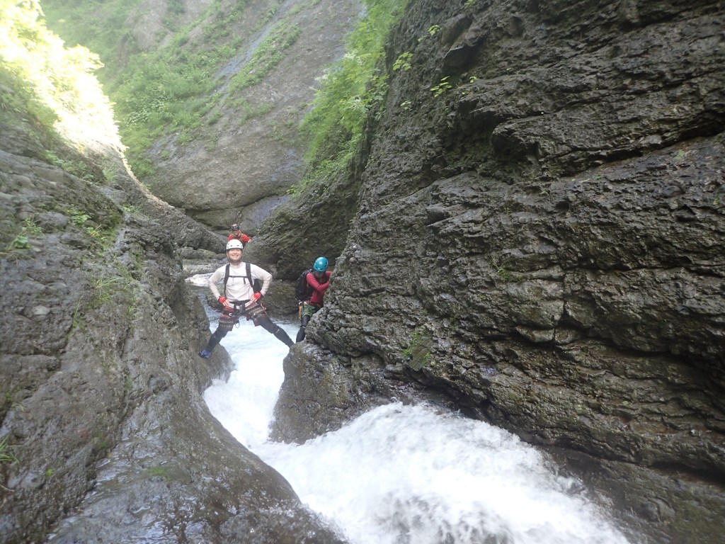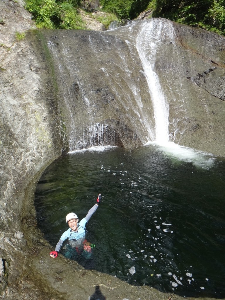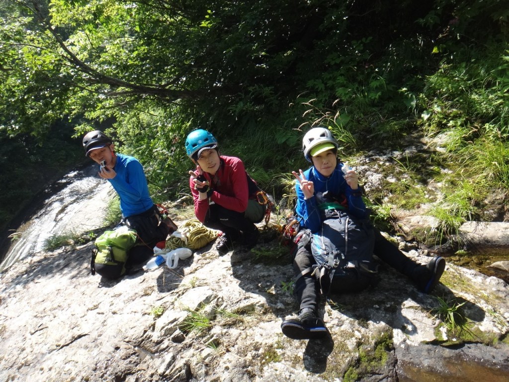 (吉川)泳ぎのある沢は初めてでしたが山宮さんが「トップ」で行ってフローティングロープを投げてくれたのでなんとか行って来られました。ぬめりが多くラバーよりフェルトの方がいいのかなと感じました。渓相は最高で特に三つ釜は感動しました。今回はリードしなかったので次回はリード頑張りたいと思います。岸畑リーダーとオールリード山宮会長ありがとうございました。