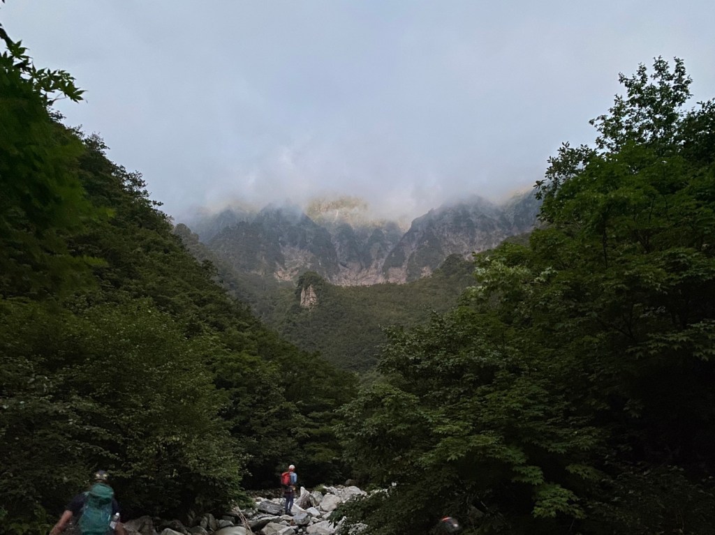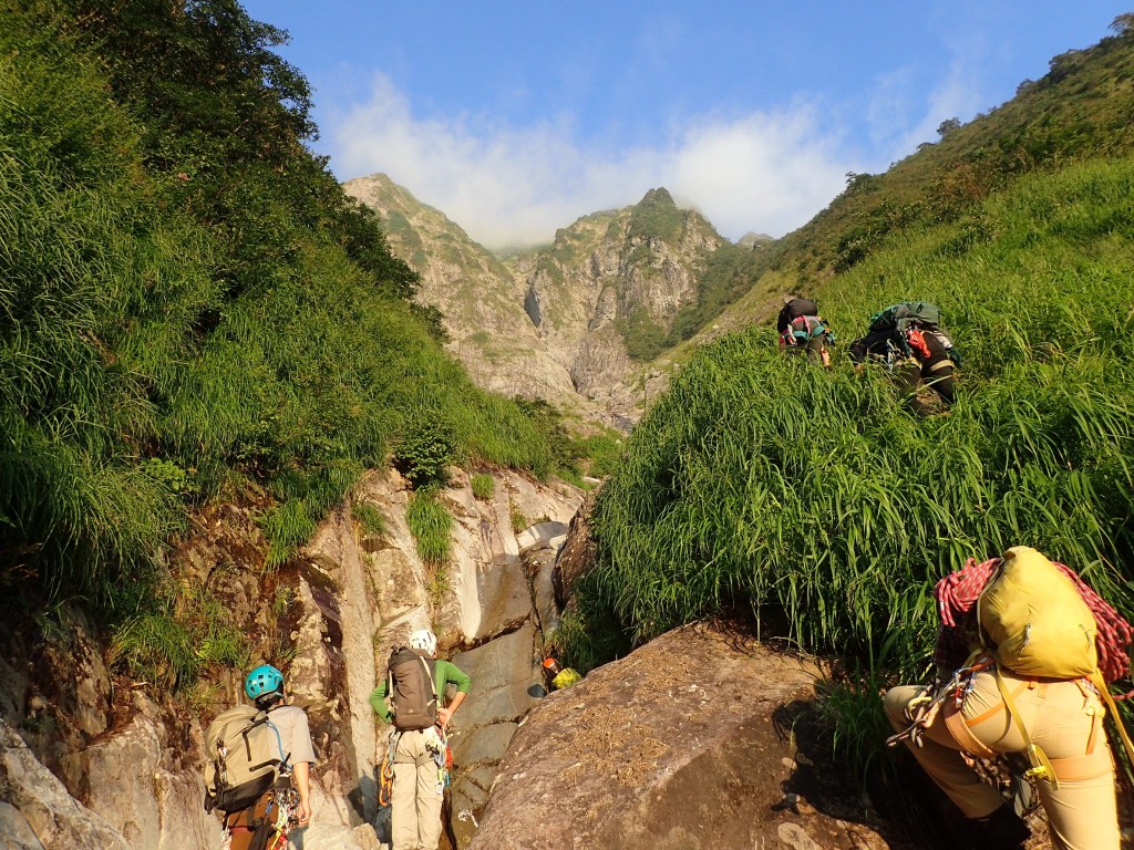 (山宮)9/11(日)は山岳会山行で幽ノ沢V字状岩壁右ルートへアルパインクライミングに行ってきました。当初は1・2班が右ルート、3・4班が左ルートに分かれて登る予定でしたが岩のコンディションや参加メンバーの希望で全班が右ルートを登りました。前日の滝沢大滝と合わせて2日間とも長時間行動だったので体重も大幅に減ったんじゃないかと期待しましたが、家で測ったら1キロも減ってなくて愕然としました。。2P目出だしのクライムダウンでA0を1度した以外は岩が濡れていてもフリーで登れて良かったです。幽ノ沢は静かで良い場所ですが、堅炭尾根の中芝新道(廃道扱い)の荒れ具合が酷く、それが山行のネックになるのかなーと思いました。取付までロープを出して登ったこと、経験不足からくるルーファイ能力の低さ(残置支点を見つけることができる視野の広さや弱点を突くルートどり)、また登攀スピードの遅さ(残置支点が無くても登っていける登攀力)から時間が押してしまい堅炭尾根の中芝新道に合流したのは予定より2時間遅れの16時でした。一ノ倉岳までの道も想定より藪化していて予定よりも45分遅くれの17時45分着。一般登山道になる一ノ倉岳からは私を含めた他メンバー6人はペースが上がり4時間予定のところを3時間30分で下山完了。(銅谷さんと羽田と最後尾を任せたSLの石附さんは24時下山でした。)今回の会山行はある意味アルパインクライミングの要素が詰まった有意義な山行だったと思いますが、登山計画書作成の段階で時間管理の読みが甘く夜遅くまでの残業になってしまいました。心配をかけ大変申し訳ありませんでした。個人の力量の把握しておくのも大事だと感じる山行になりました。
