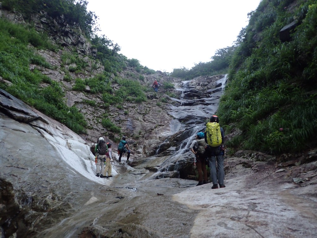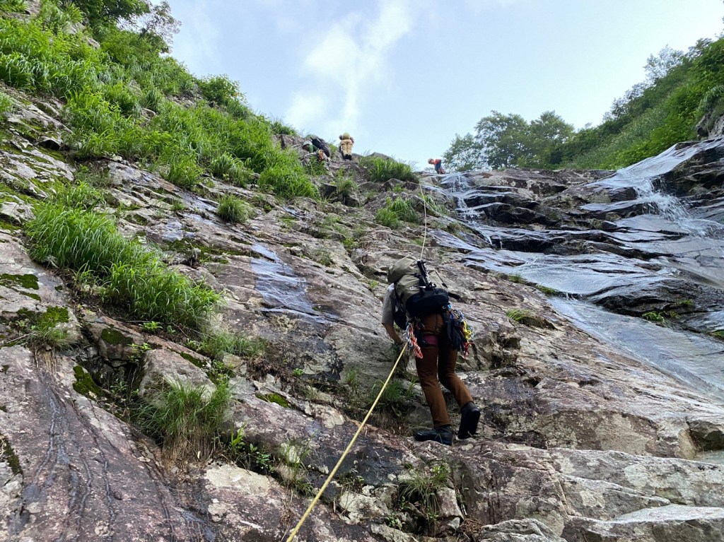 ・二俣下の大滝は滝左側をフリーで登りました。滝上には終了点があります。後続メンバーには念のためロープを出してフィックスして必要な人はタイブロック等を使い登ってました。