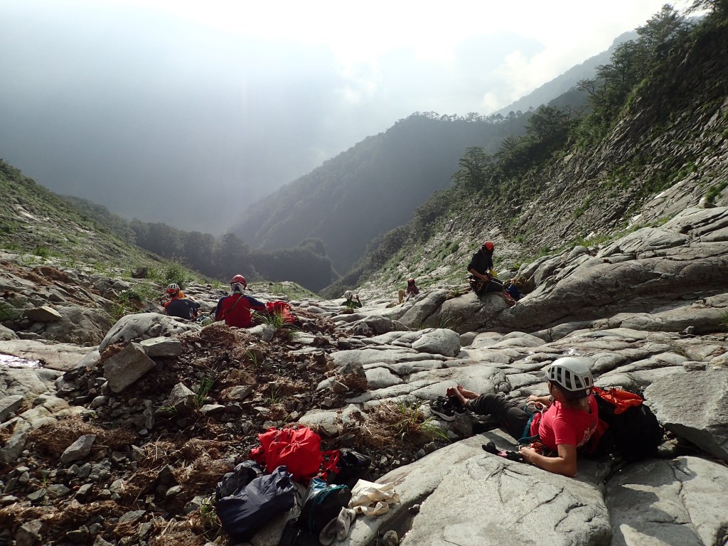 ・V字状岩壁右ルート終了点でアンザイレン解除。ロープや要らないギアはザックに片付けクライミングシューズからアプローチシューズ又はラバーの沢靴に履き替えました。