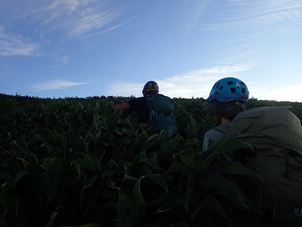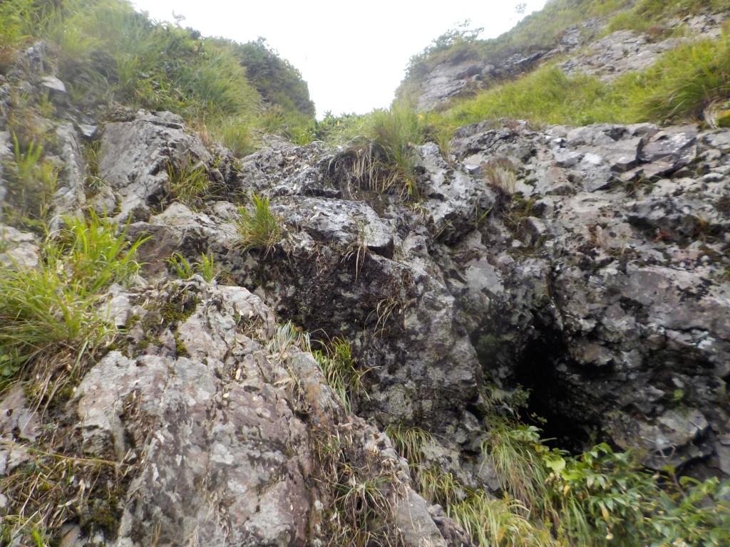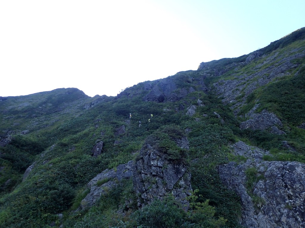 ・草付ルンゼの足元は段々になっているが泥なので滑る。また手がかりになる灌木がなく抜けそうな草を頼りに登るので微妙な登りになる。