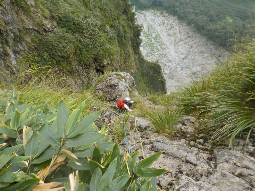 ・トポ1P目60mの後半。リッジ上のテラスからクライムダウンして要テラスまでトラバース~右上。(クライムダウンする個所に残置ロープあり。)