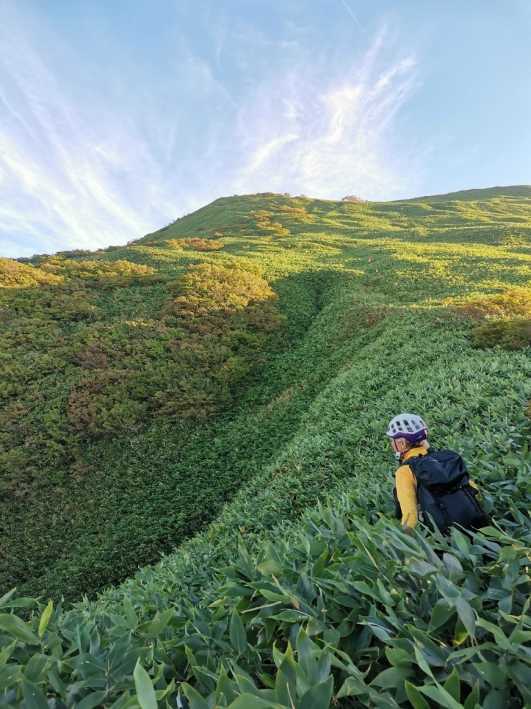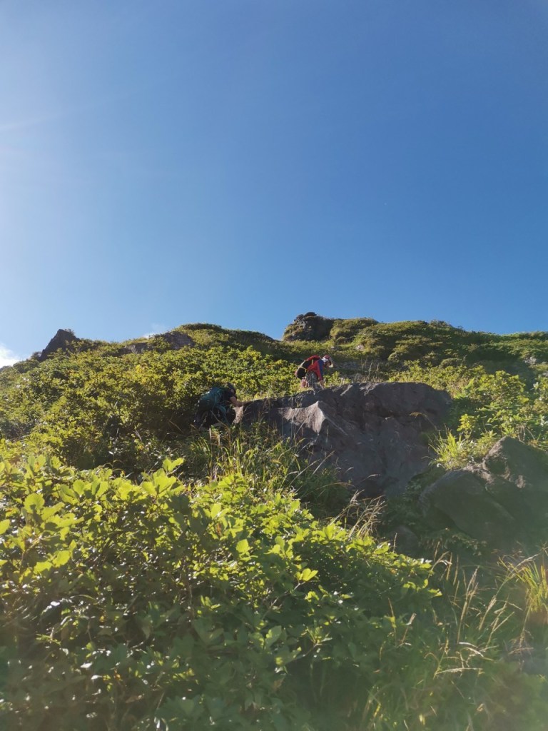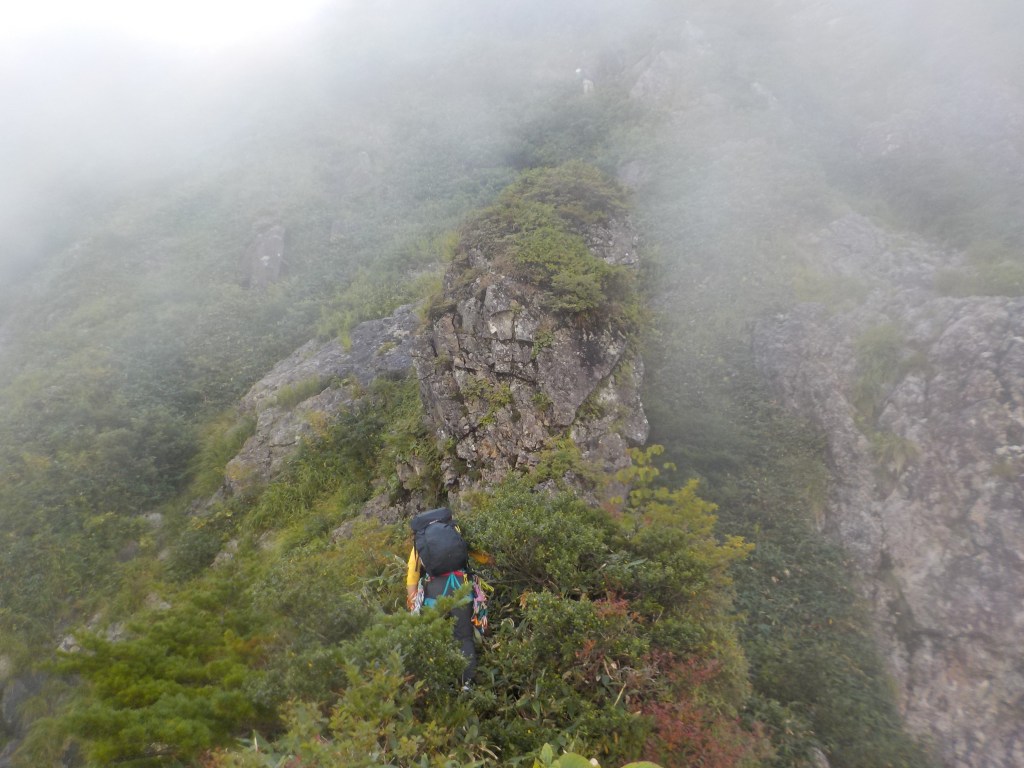 (銅谷)カールボーデンで左ルートから右ルートに変更になりトポ図のみの情報でルーファイが不安の中でのスタートでしたが核心Pもリードで行ったり、終了点までロープが足りず始めて自分でハーケンを打って終了点を作ったり。灌木や草を束ねて終了点を作るPもあり良い勉強と経験になりました。堅炭尾根〜一ノ倉岳への頭まで隠れる笹の藪漕ぎに体力を奪われてしまい水も無くなり辛かったです。西黒尾根の下山も遅くなり皆さんを遅い時間まで待たせてしまい大変迷惑をかけてしまいました。事務局の皆さんにもご心配おかけしました。1日ありがとうございました。