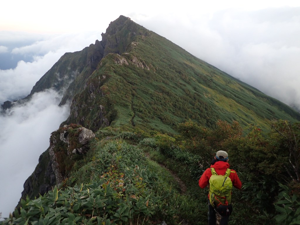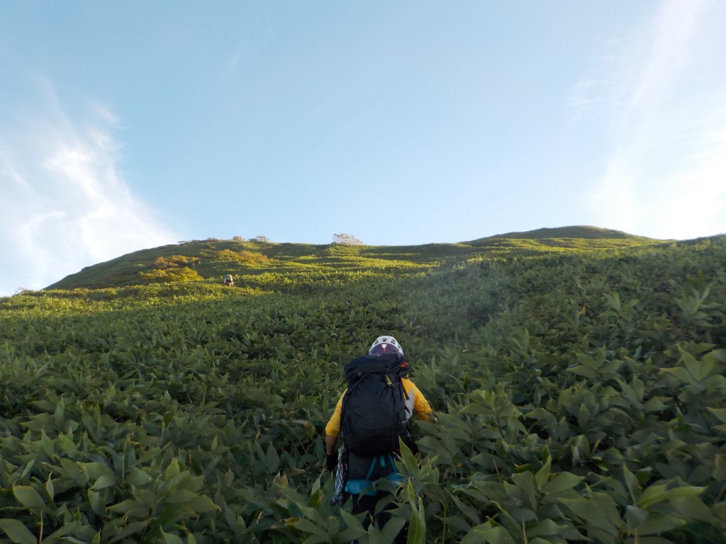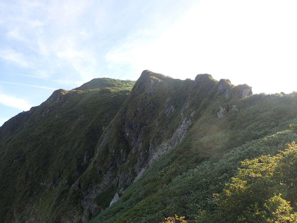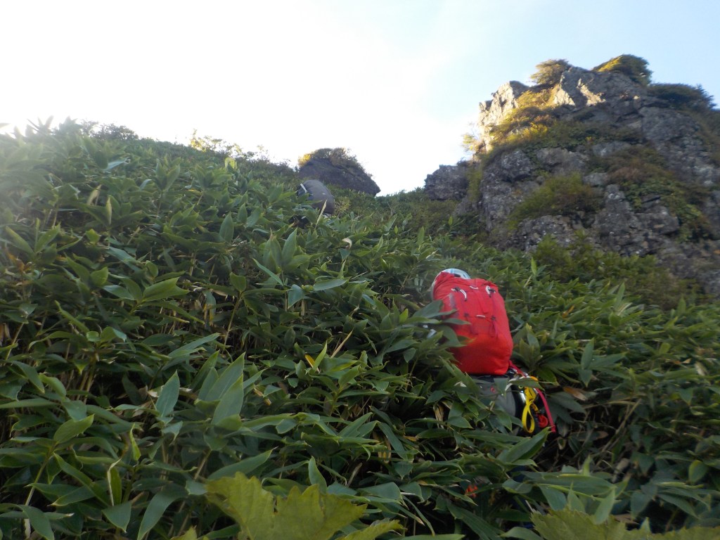 ・終了点から正面に見える岩峰は左から巻き、そこから薄い踏み跡の草付を登っていき岩に突き当たったら左から回り込み直上する。しばらく藪漕ぎすると堅炭尾根へと出る。