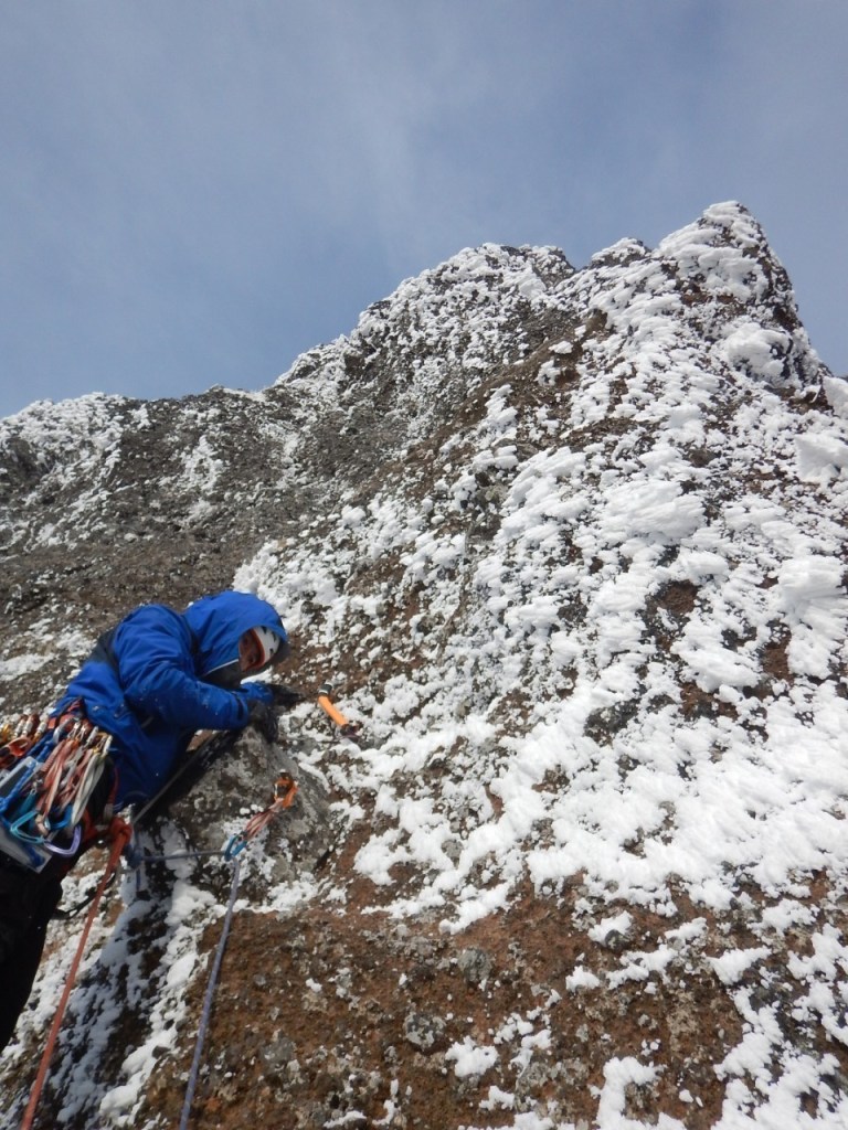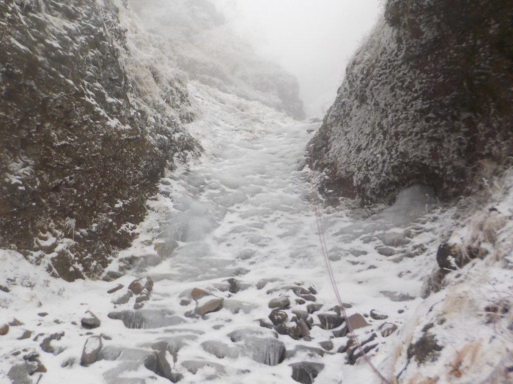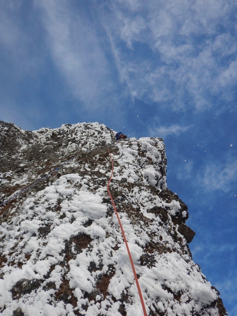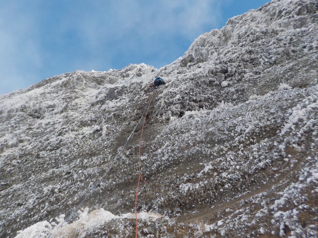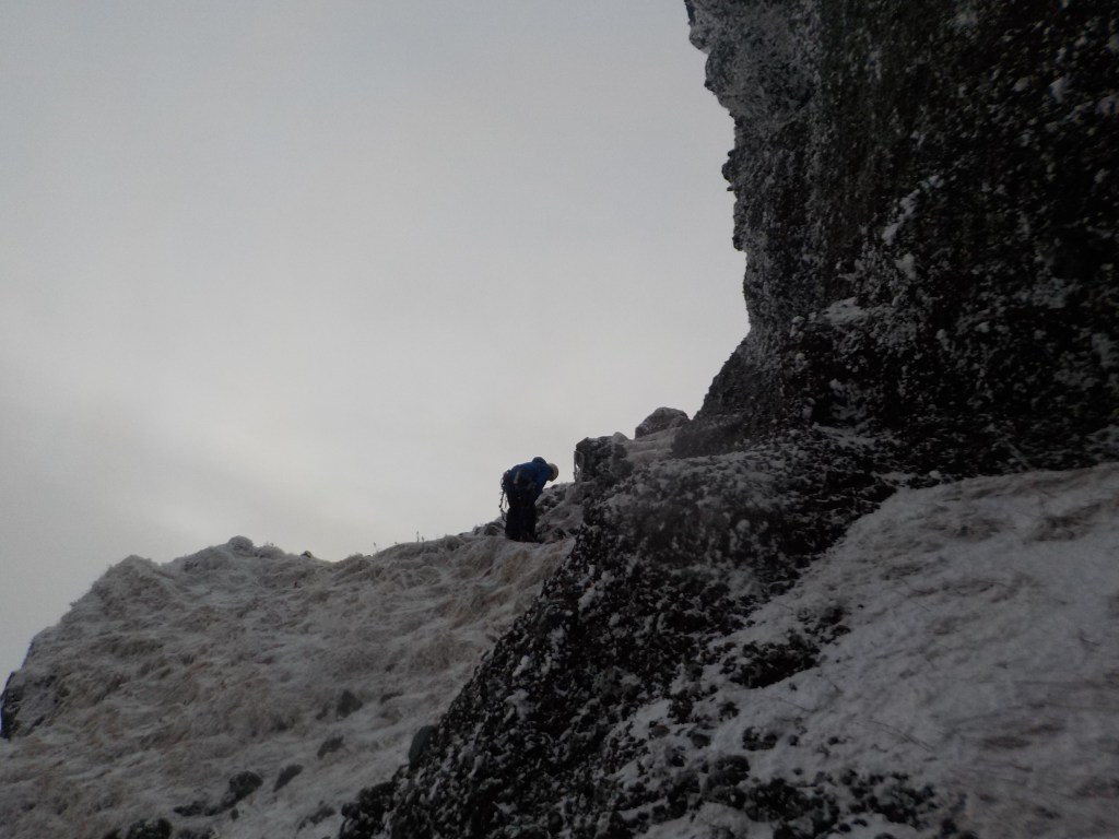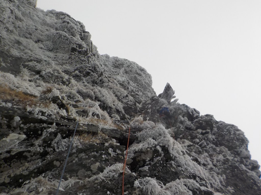 ・上部に見える魚の尾ひれの様なピナクル目指し高度を上げる。出だしは終了点の左上の草付から。草付と有ってランナーは取れない。凍った草付にアックスを打ち込み慎重に抜け、上部凹角へ。凹角は短いが着雪が多く神経を使う。上部トラバース地点までロープを延ばした方が良いのだがロープがスタックした為、尾びれピナクル脇のRCC二本で切る