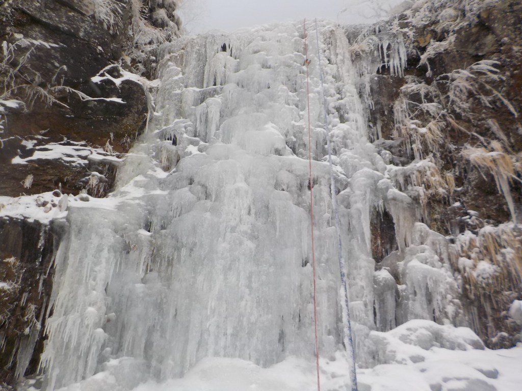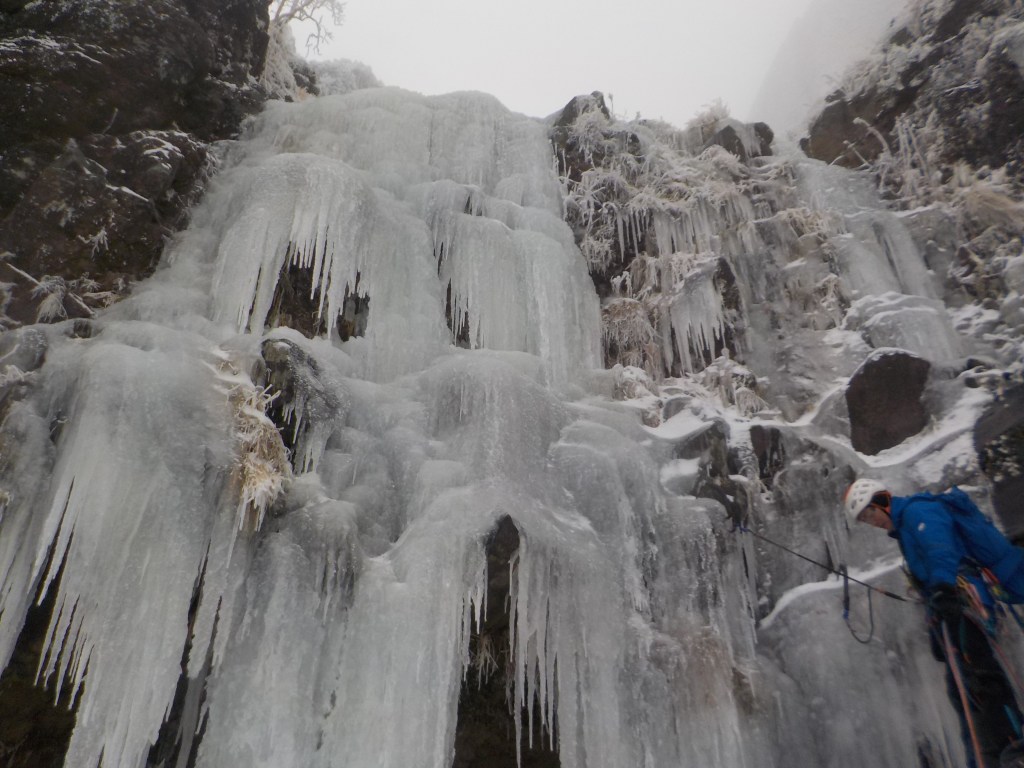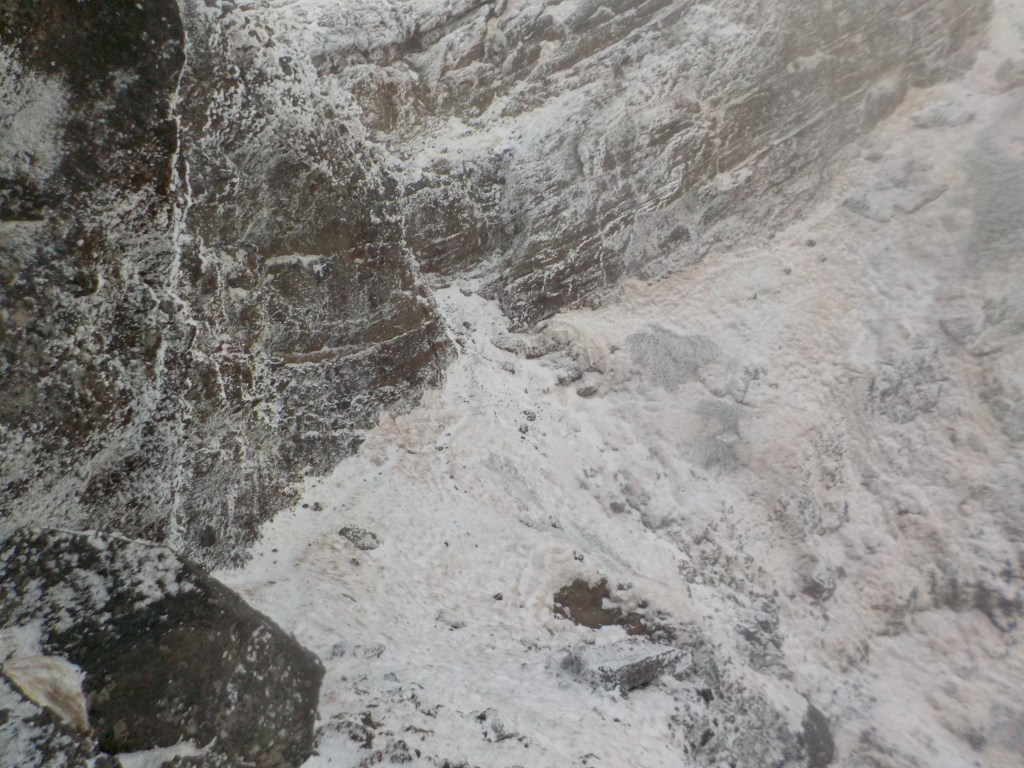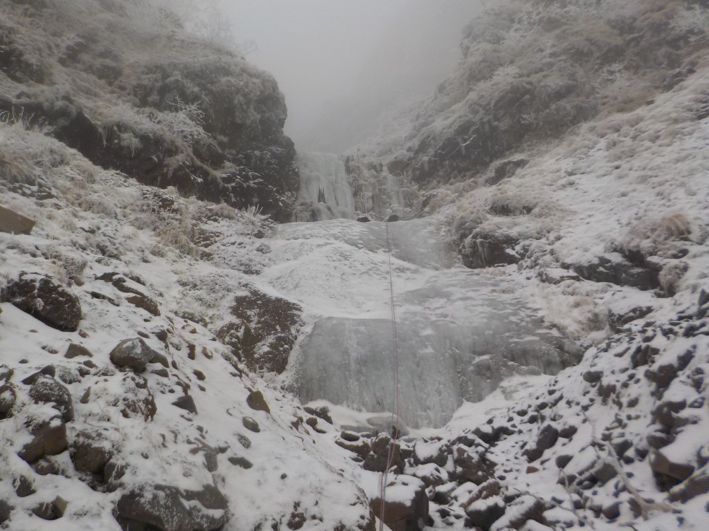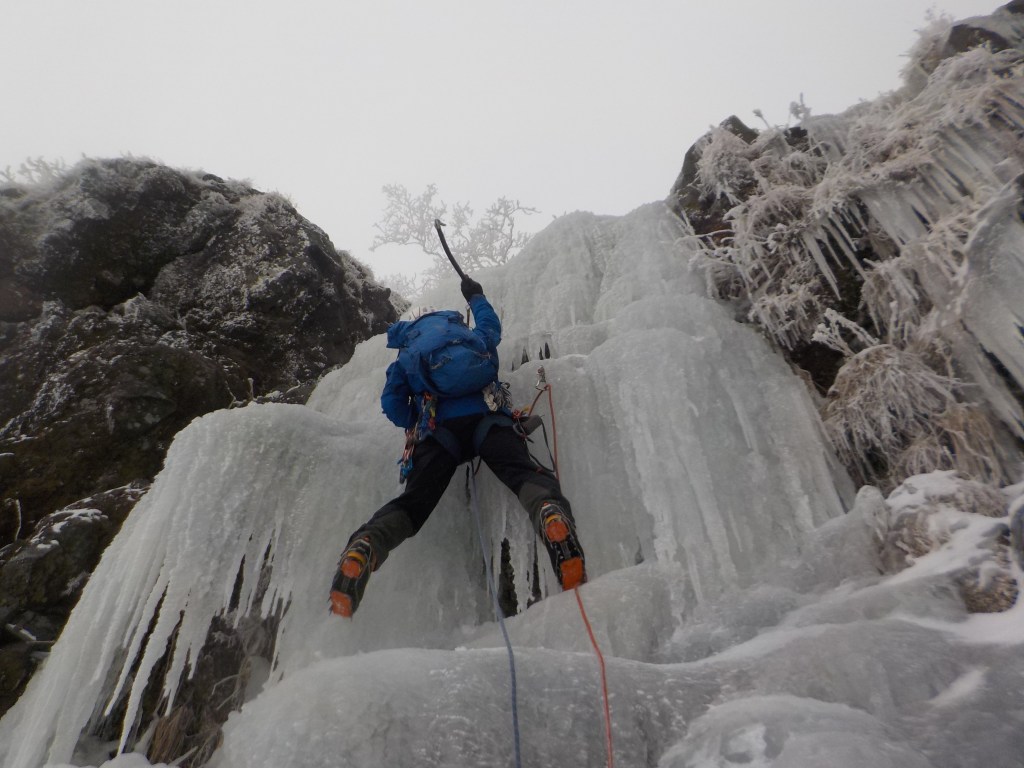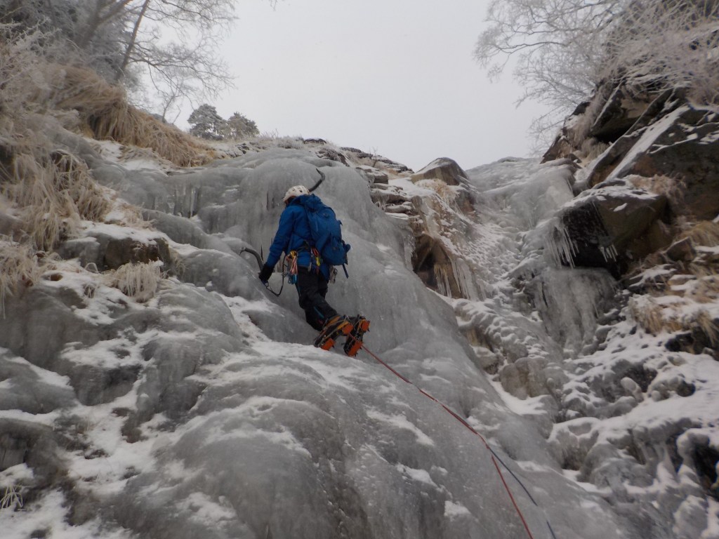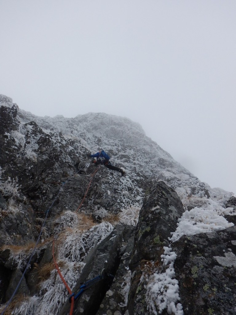 ・上部に見える魚の尾ひれの様なピナクル目指し高度を上げる。出だしは終了点の左上の草付から。草付と有ってランナーは取れない。凍った草付にアックスを打ち込み慎重に抜け、上部凹角へ。凹角は短いが着雪が多く神経を使う。上部トラバース地点までロープを延ばした方が良いのだがロープがスタックした為、尾びれピナクル脇のRCC二本で切る