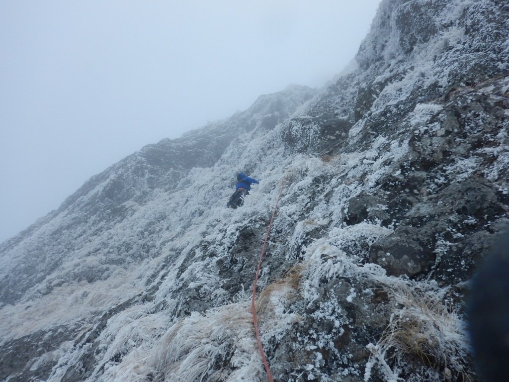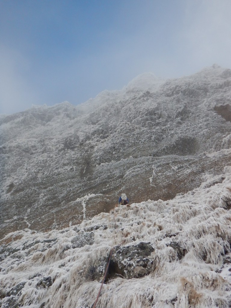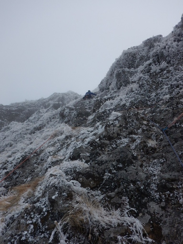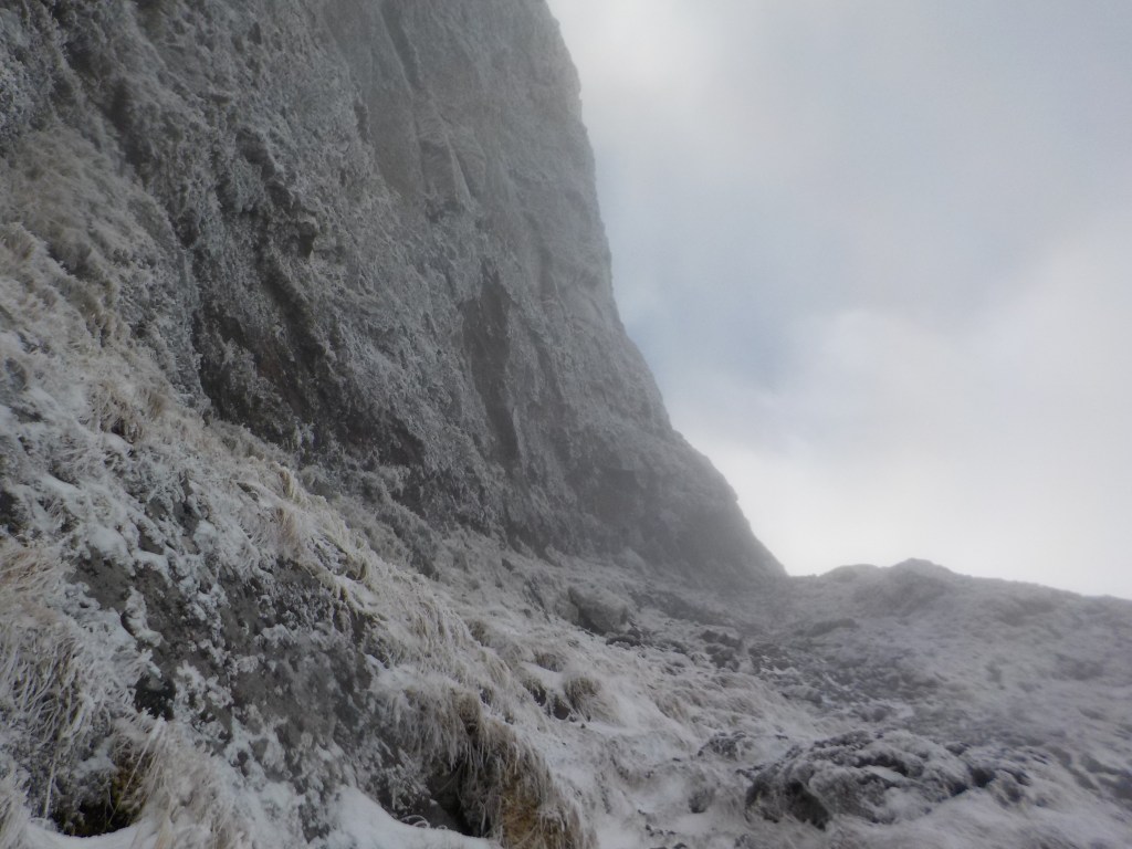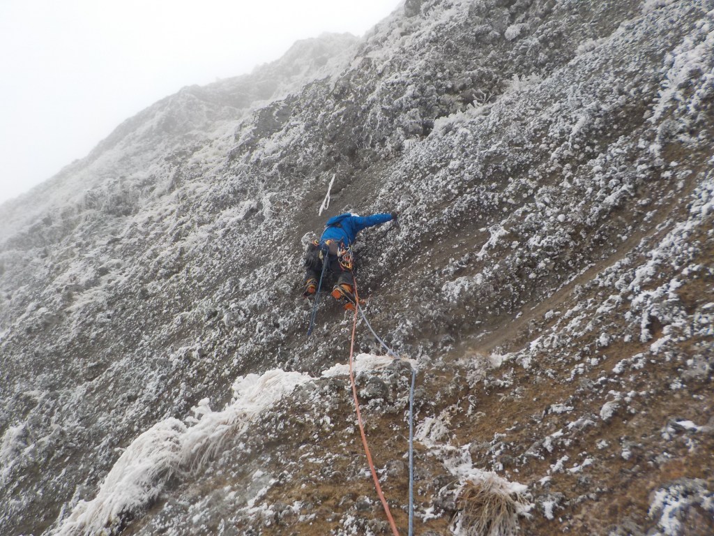 ・草付混じりのフェースから高度を上げる。途中二手のラインが取れる。凹角か凹角を左に回り込むか。凹角はランぺ状な為ドライでは難儀しそうだったので後者を選択。ラインが屈曲するのでランナーの取り方には注意が必要だった。凹角脇を通過し右上気味に高度を上げれば草付基部のテラスへ
