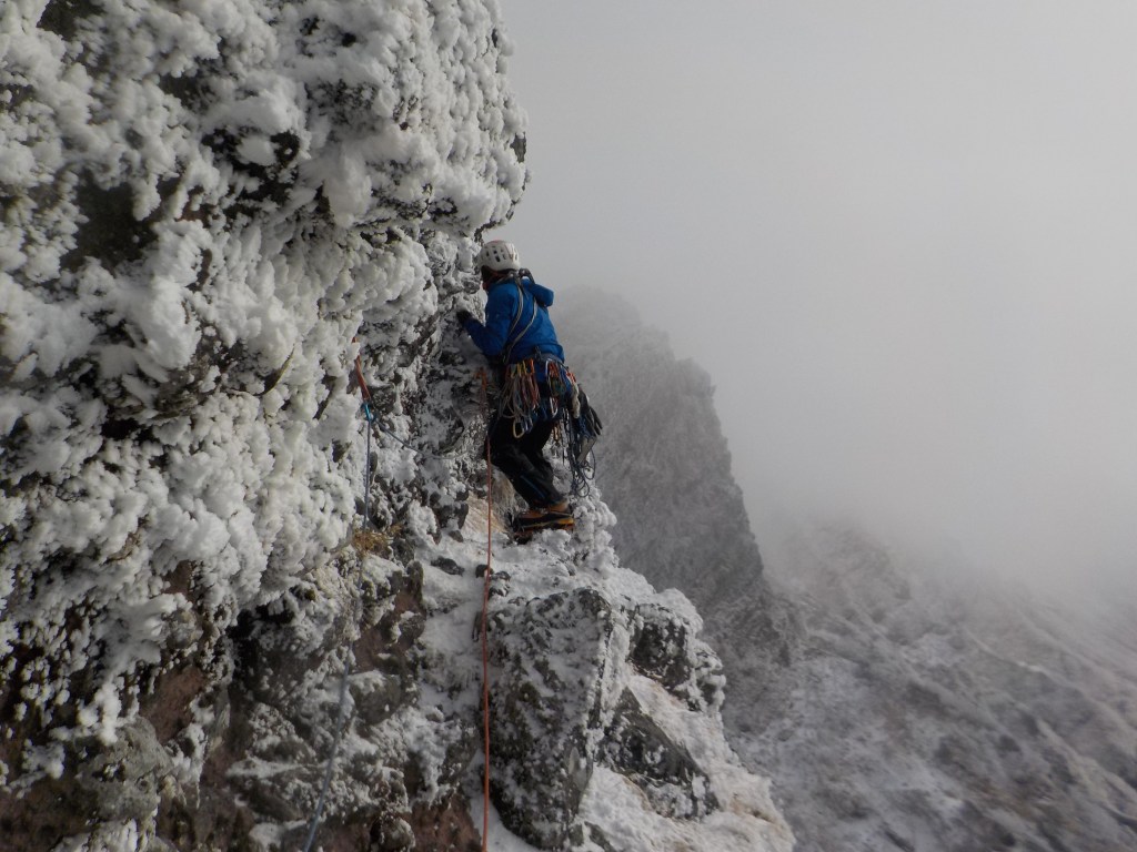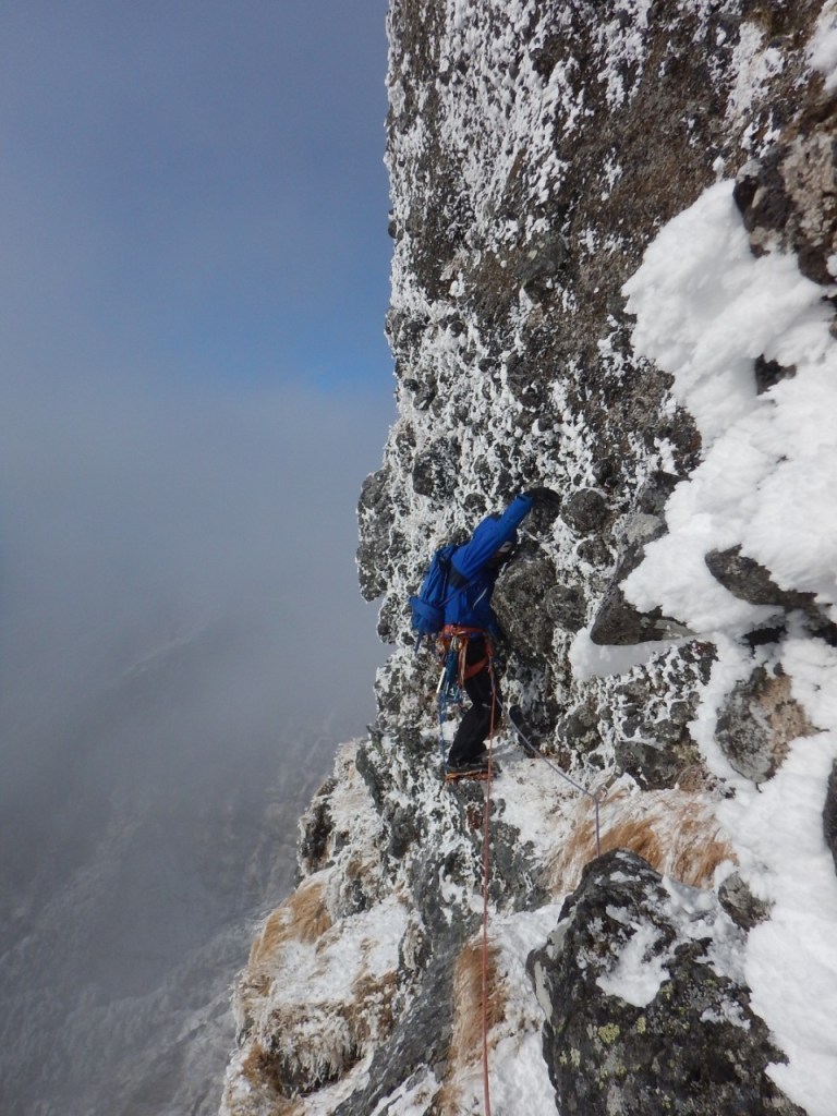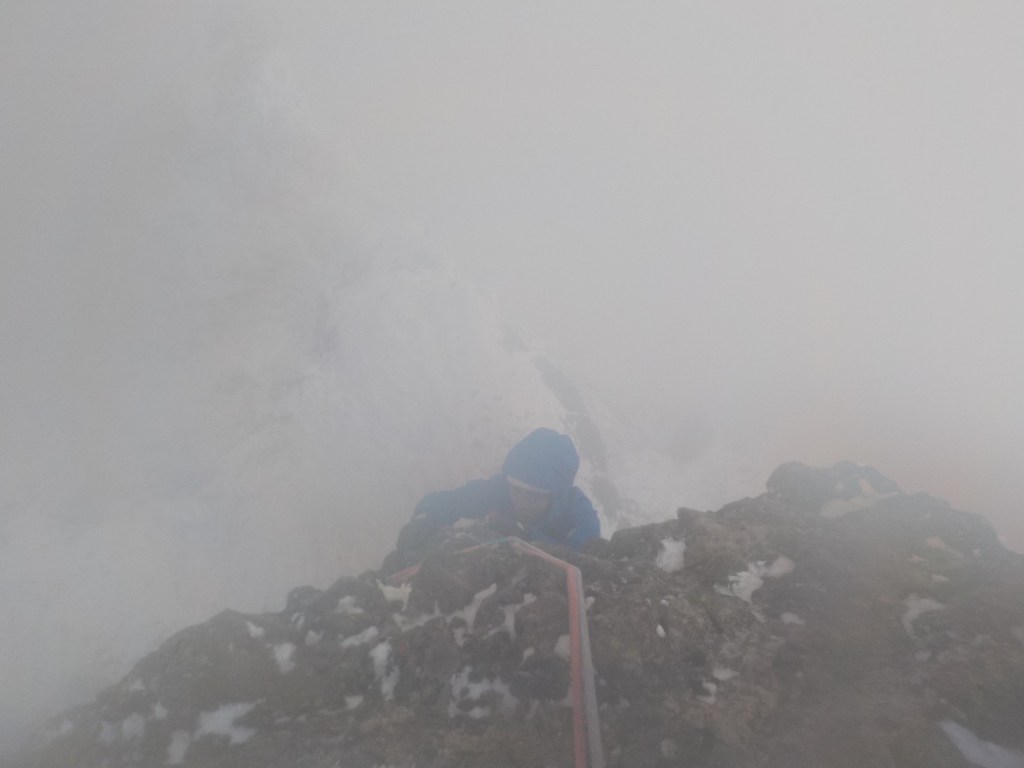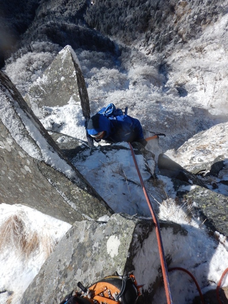 ・巨大カンテの登攀。フェースから高度を上げ中間部よりカンテにラインを移しボルトラダー。当初はフリーで抜けたい考えが有ったが、着雪が酷くフリーの考えは皆無。カンテに移ってからは高度感が凄まじい。カンテを抜ければ大同心の頭に突き上げ登攀終了