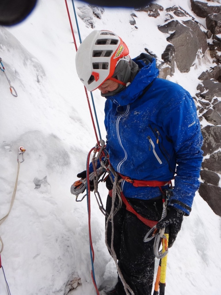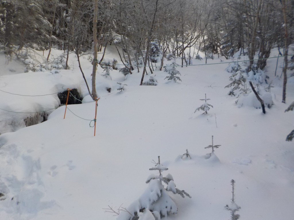 (山宮)シーズン始めのリード登攀でしたが上部の垂直部を半分まで登らないところでハードシェルは上下共バリバリになるし、左手のグローブがぐしょぐしょに濡れるしでテンションだだ下がり。腕も疲れてきてレストしながら試案しましたがシーズン始まったばかりなのに落ちて怪我はしたくないので素直にテンションしました。(相変わらずメンタル弱い・・・)テンションしながらレストしていると指に血流が戻ってきてしばらく痛みに耐え、再び登り始めるとすんなりトップアウトできました。(スクリューは下部で2本、上部で4本、滝上~支点までで1本を使用)ダブルロープ、懸垂下降用バックアップスリング、アイススクリューの中の氷、クイックドロー、カラビナ等々いろいろ凍って大変でした。凍った装備の処理が面倒でリードは山宮の1回のみ。トップロープも1人2回ずつ登ったら下山予定時刻になり体力的にはまだまだ登れましたがあえなく時間切れ終了となりました。トップロープ1回目は適当にバタバタ登って全く練習になりませんでした。下りてから下でアイスアックスの打ち込み練習をしたら感覚を良い感じで思い出せて2回目のトップロープではアイスアックスが1回で決まる回数が増え良かったです。