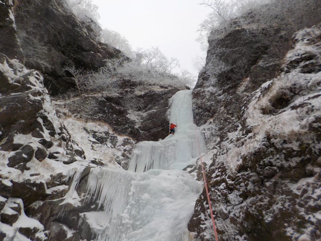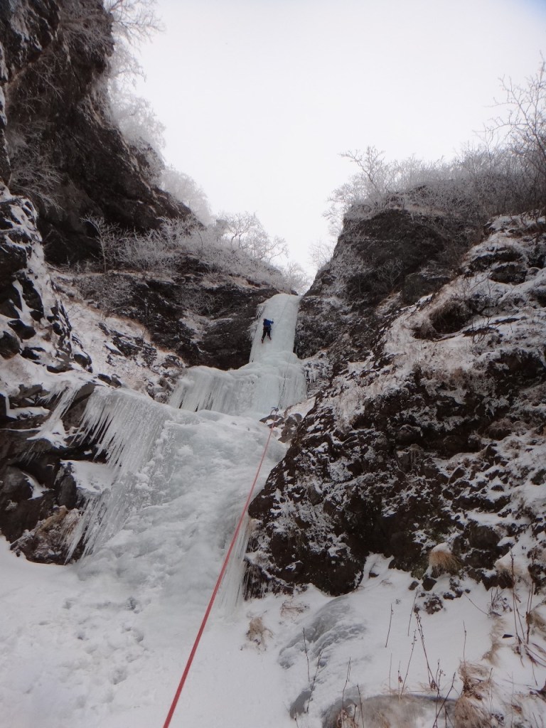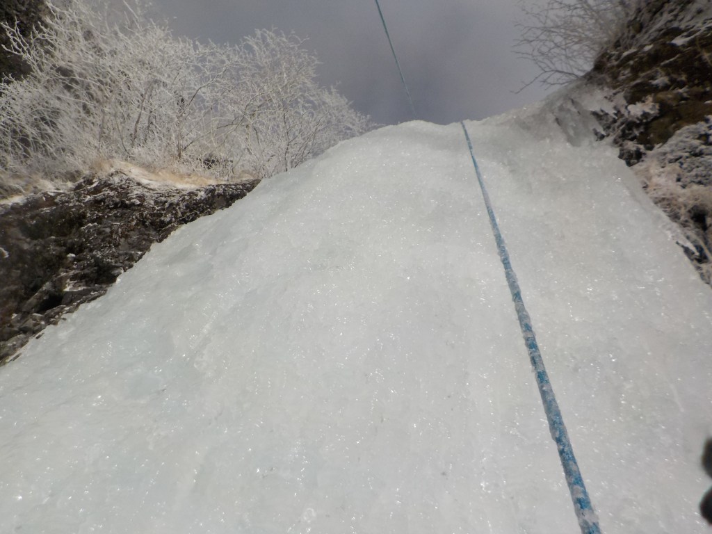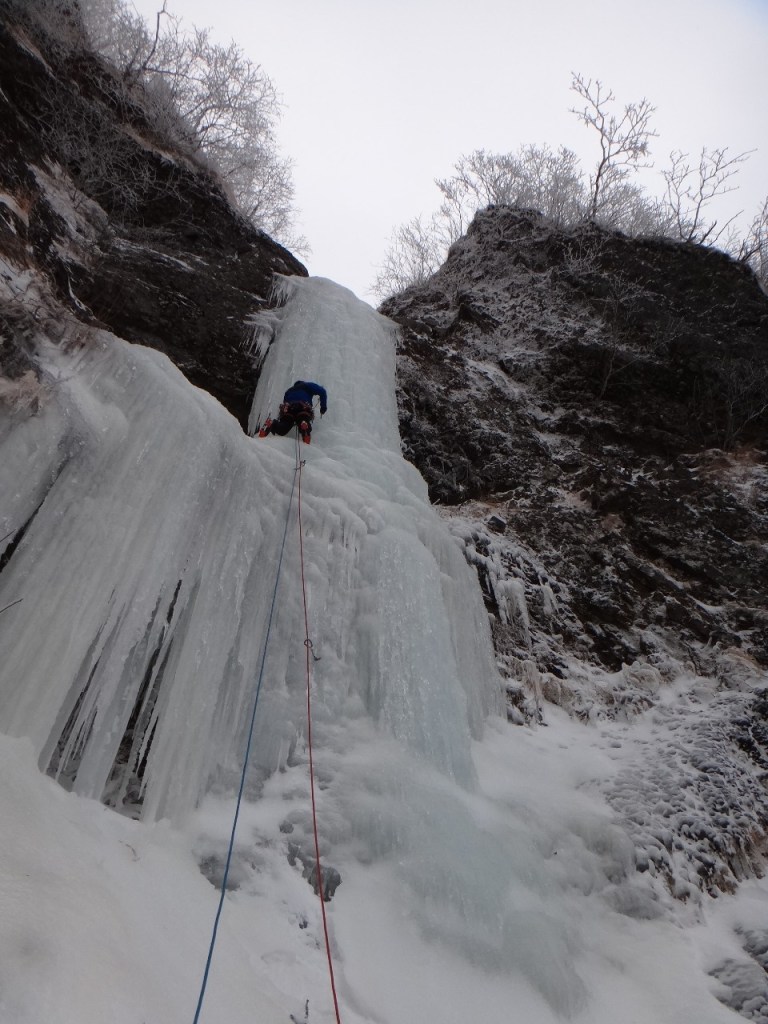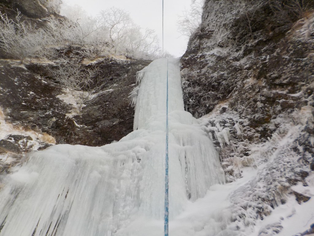 ・大同心大滝は60mのダブルロープ2本で登りましたが基部から1段上がったリード登攀したところから今回使用した終了点(トップロープ用の支点)まででロープ半分ぐらい出てたそうなので、今回登攀したところでトップロープのビレイをするなら70mのシングルロープ1本あれば大丈夫だと思います。(60mのシングルロープの場合はギリギリな感じだと思います。)