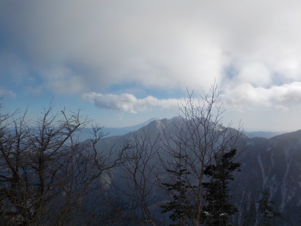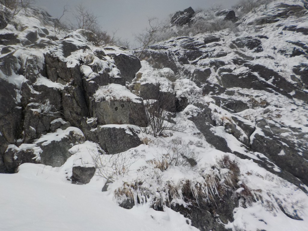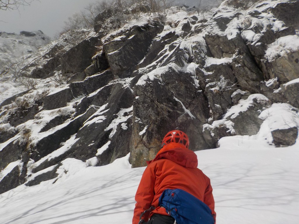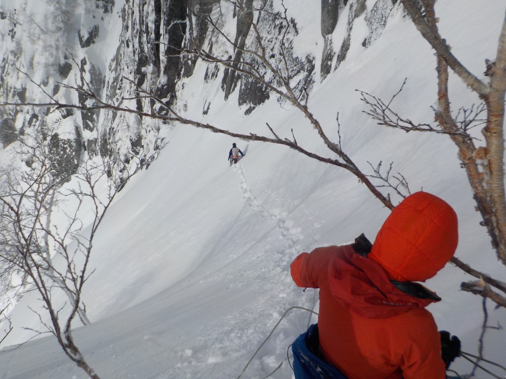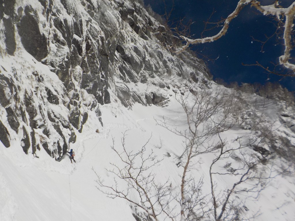 ・八合目の岩小屋から赤石沢奥壁の取付まではラッセルでした。第1バンドの下降は積雪量が多く傾斜も強いので万が一雪崩れて滑り落ちないように灌木を支点にしてロープを出しました。