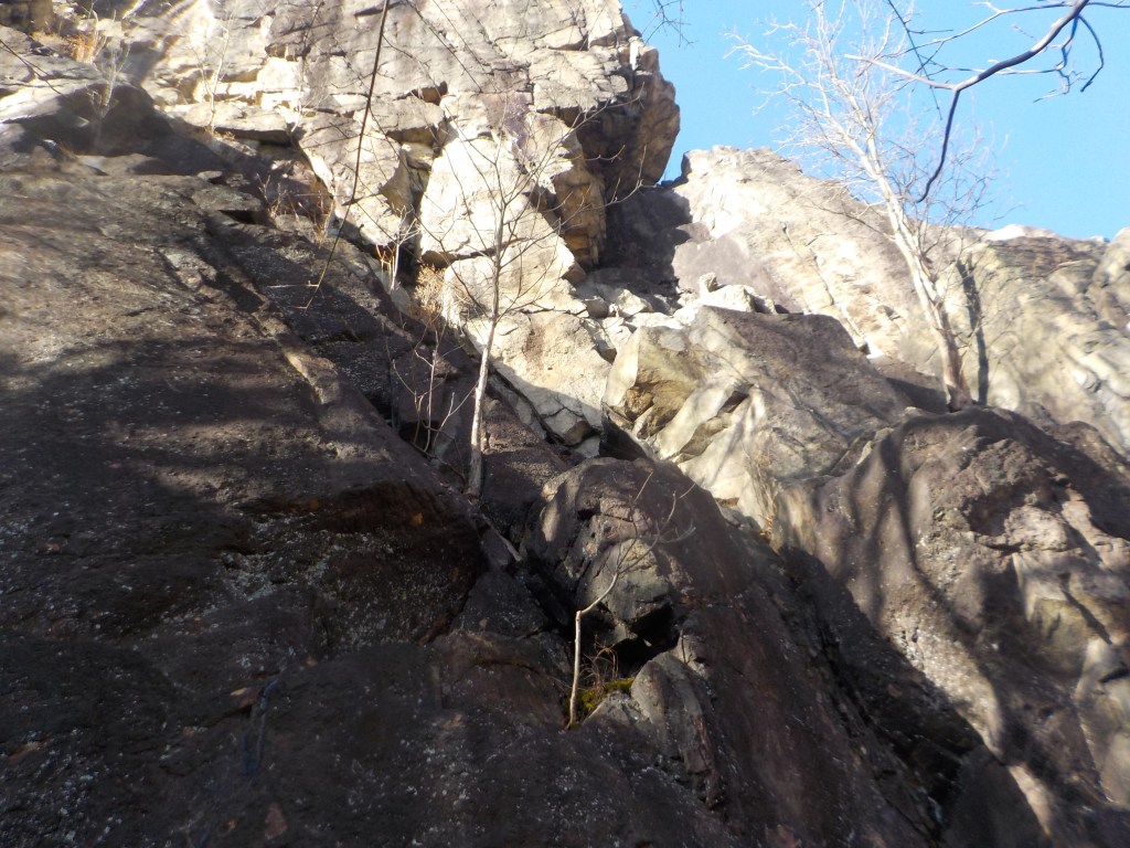 ・クラックのあるフェースを登り、後半はガレ場を大スラブ下までロープを伸ばす。(終了点は無いのでカムや灌木等で切る。)