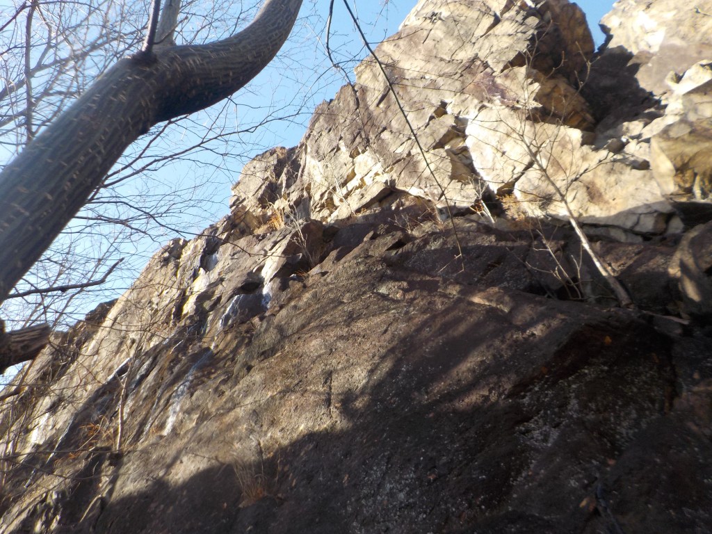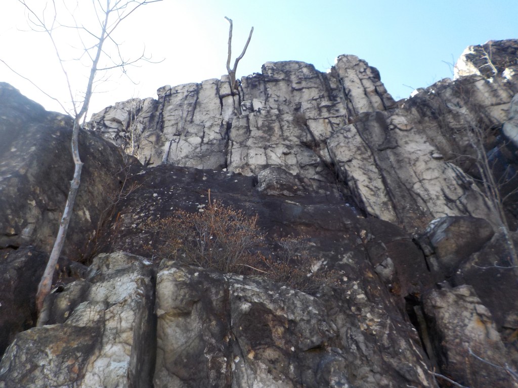 ・大スラブには3つのルートがあり見上げる。左から左ルート、直上ルート、中央ルンゼルート。左ランぺルートは大スラブから左ルートと合流するので左ルートのクラインを登っていきます。