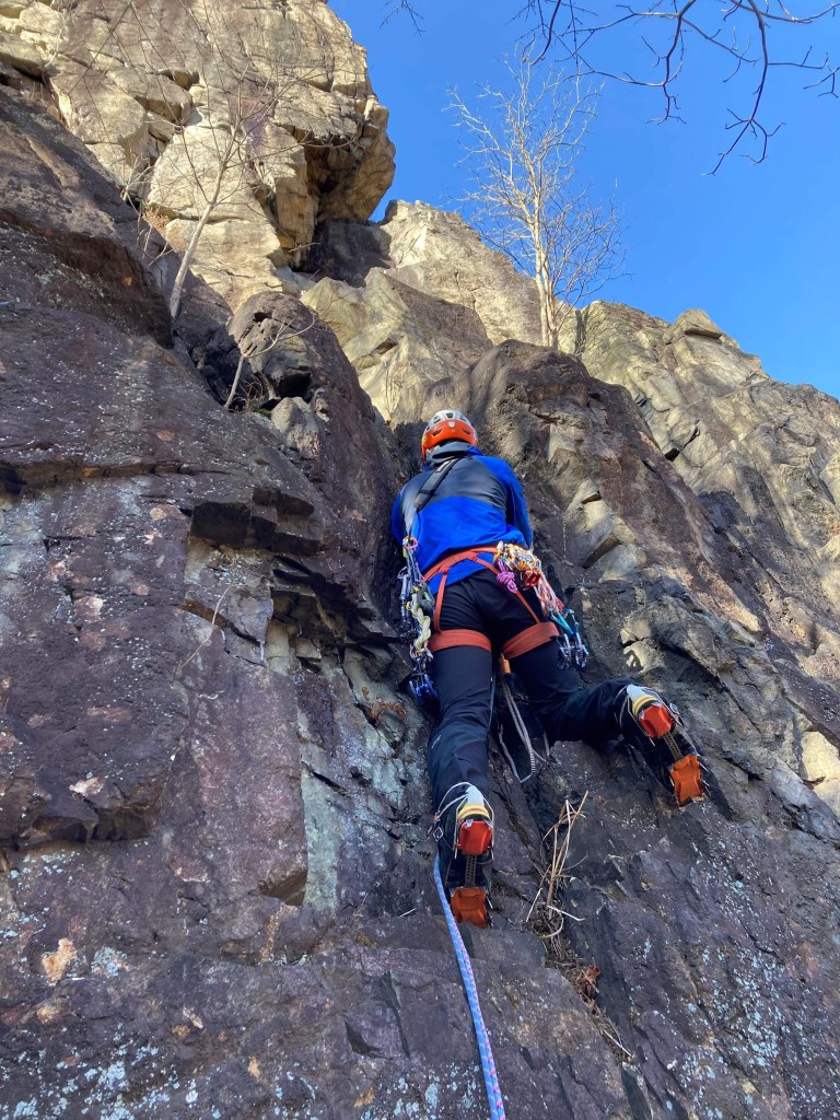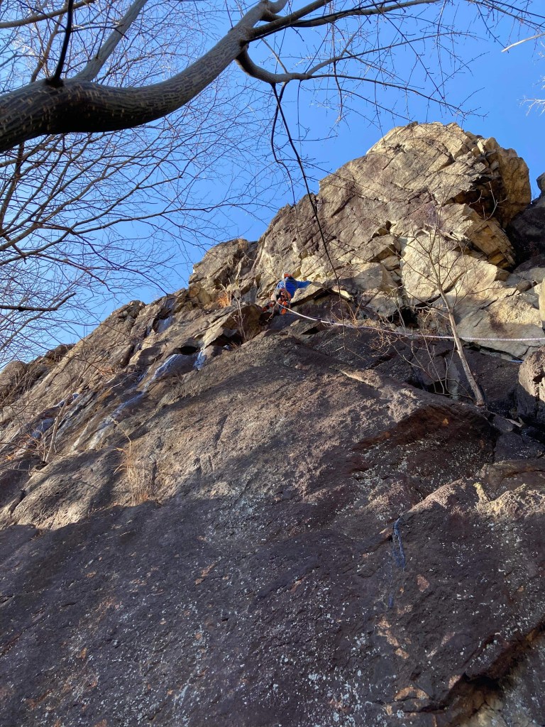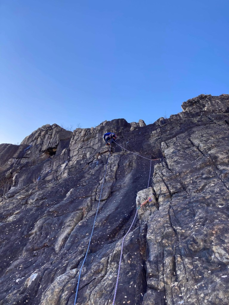 ・核心のところはプロテクションが取りにくく良いスタンスが無いので難しかったです。ナッツで取ったプロテクションでA0して身体を安定させて先の様子を探り持てそうなホールドを見つけたので意を決して身体を左に移動させて突破しました。(この持ったホールドの手前にアンダーでフッキングできそうなところがあってそれを使うムーブが正解だそうですが、微妙なナッツでのプロテクションで外れそうなフッキングで身体を移動させるのは怖いと思います。)