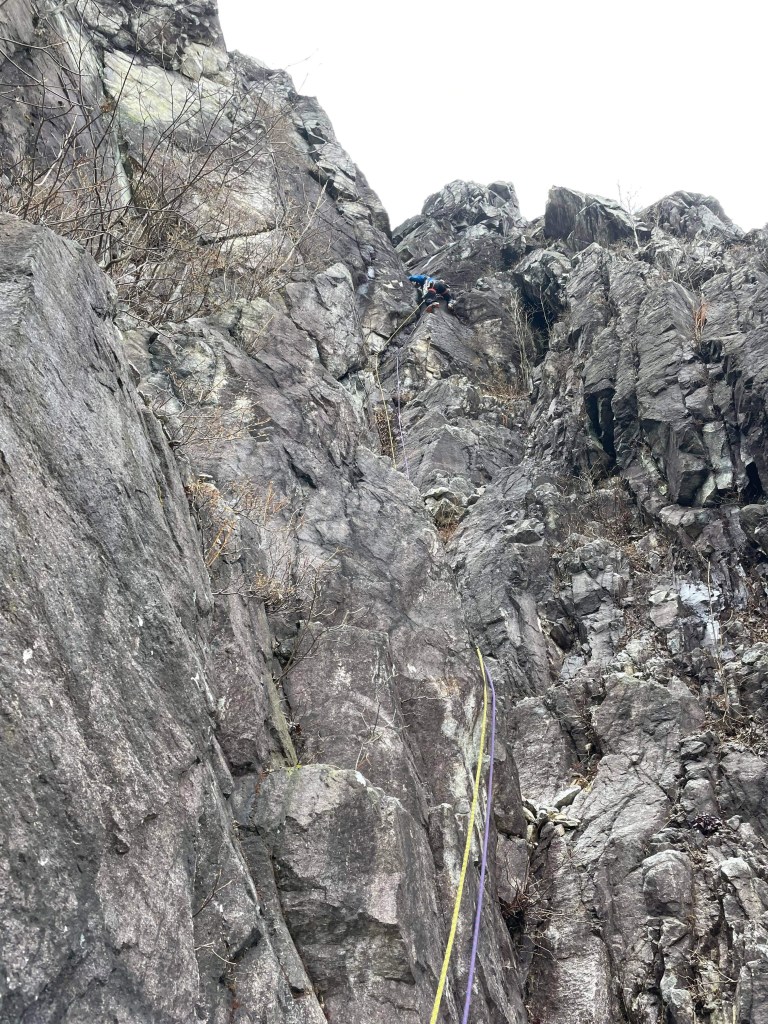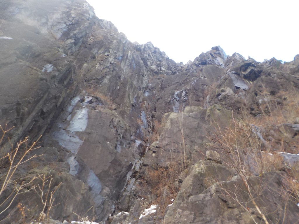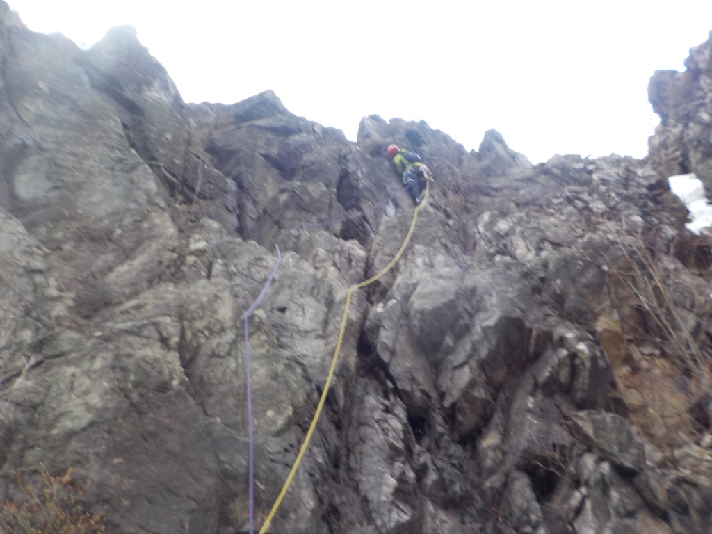 ・凹角をどん詰まりの岩は左から階段状を登るルート(Ⅲ)と右からクラックを登るルート(Ⅳ)がありましたが冬期のアイゼンでの登攀の場合は左から無難に登られているらしく今回もそれに習い左から登りました。(私へルートを説明のためOさんはこの岩の下の灌木で一旦ピッチを切ってくれてました。その後引き続き3P目終了点までOさんリード)