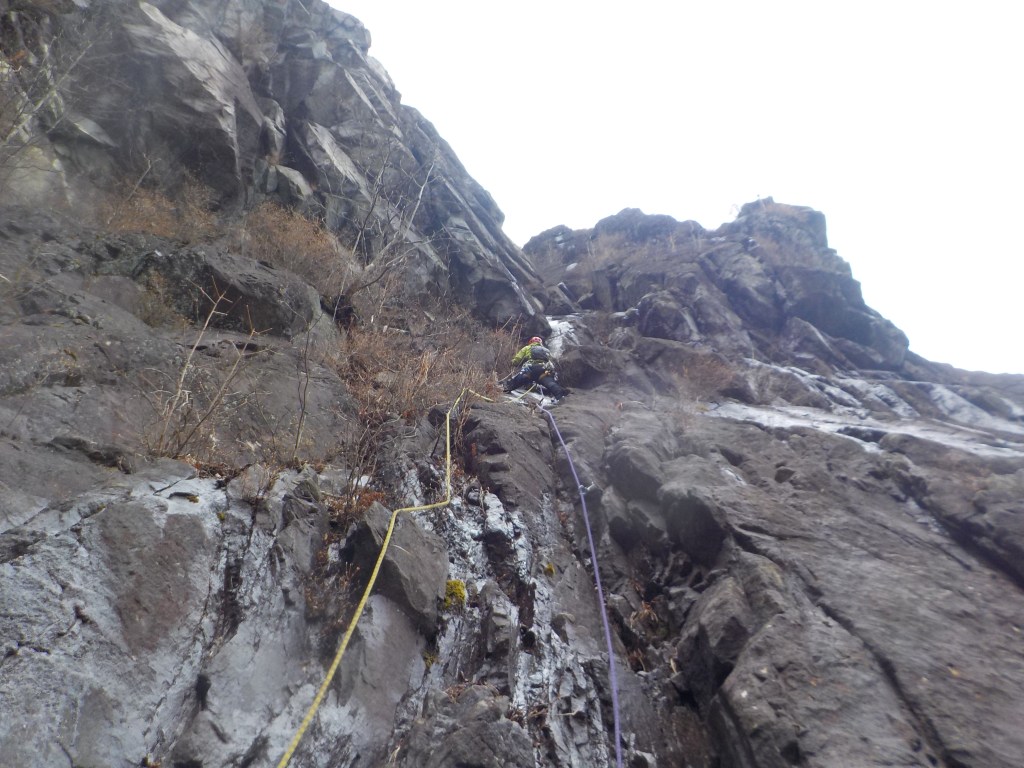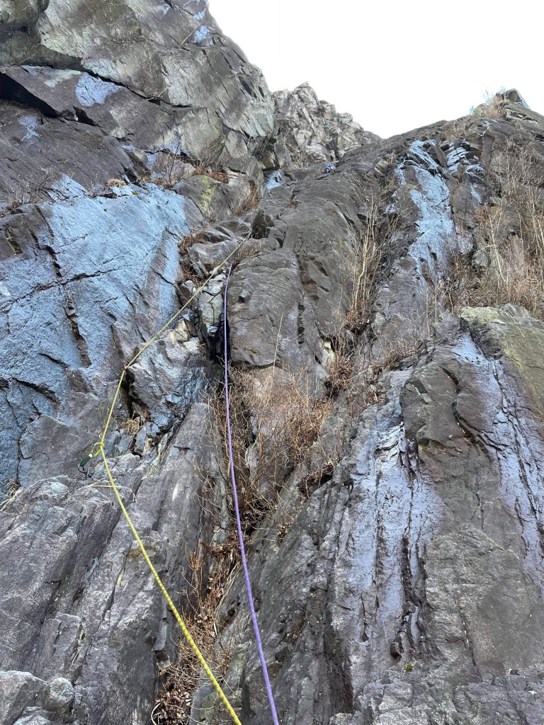 ・基本はカムやナッツ、灌木等で中間支点を取りながらの登りとなります。(残置支点は5ピッチで3~4個ぐらいだったかな?)