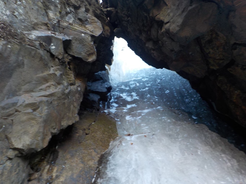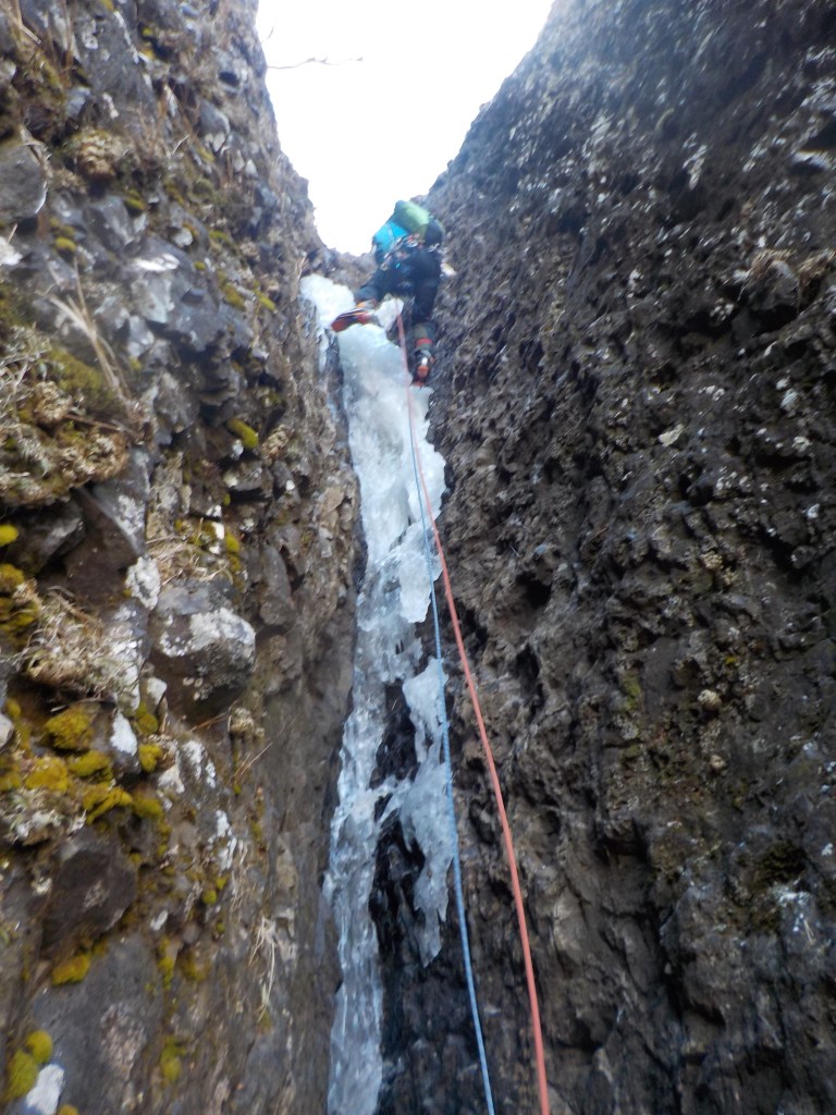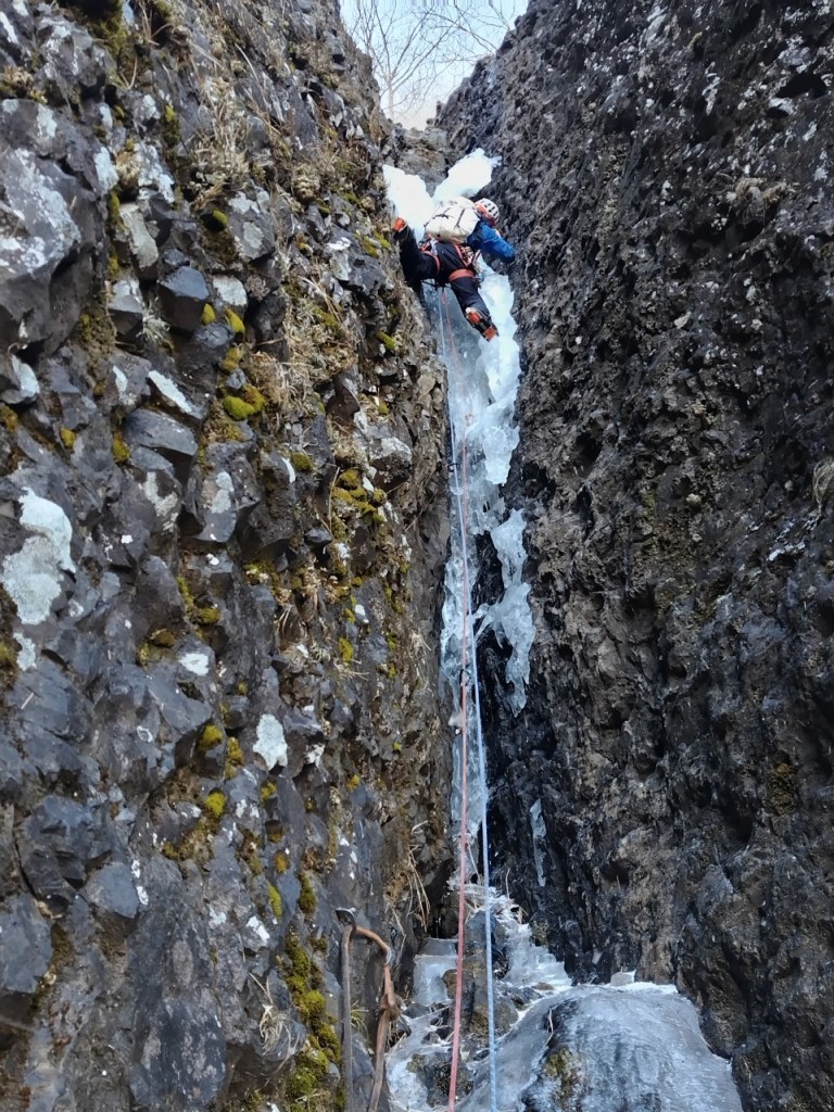 ・フェース状の氷瀑を登ると次は洞穴が現れるがアックスを振るのに難儀しそうなのでリードのWさんは左のチムニーを登る。