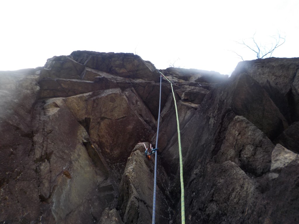 ・中間支点を取るクラックや灌木があるのでカムやスリングで支点を取りながら登ります。
