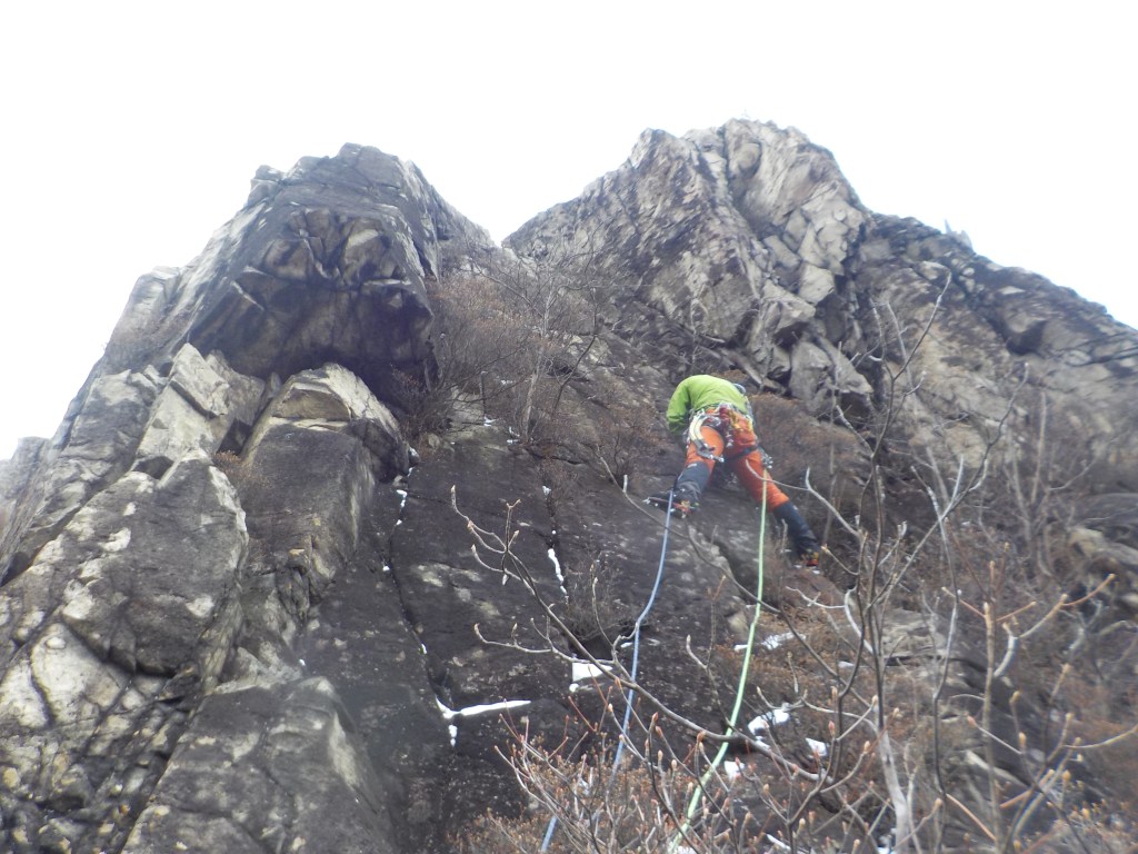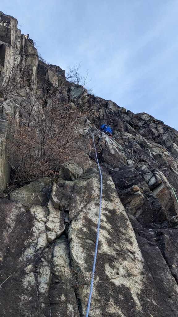 ・中間支点を取るクラックが無く角岩にスリングや残置支点で中間支点を取りながら登りました。ランナウトしますが右のフェースは簡単なので。