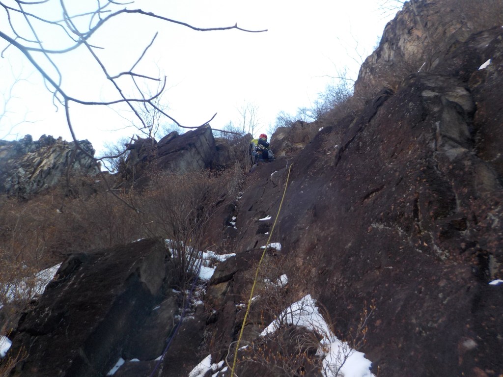 ・出だしの階段状をフリーで登って、灌木にスリングを巻いてビレイヤーはセルフビレイ。そこからアンザイレン開始しました。