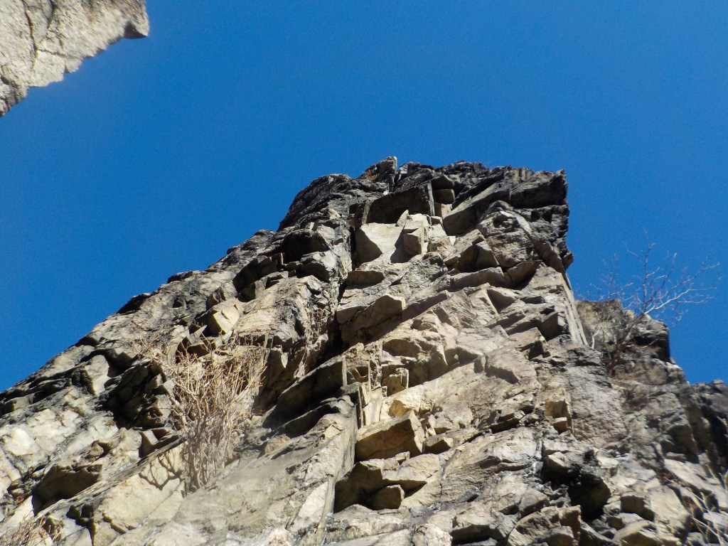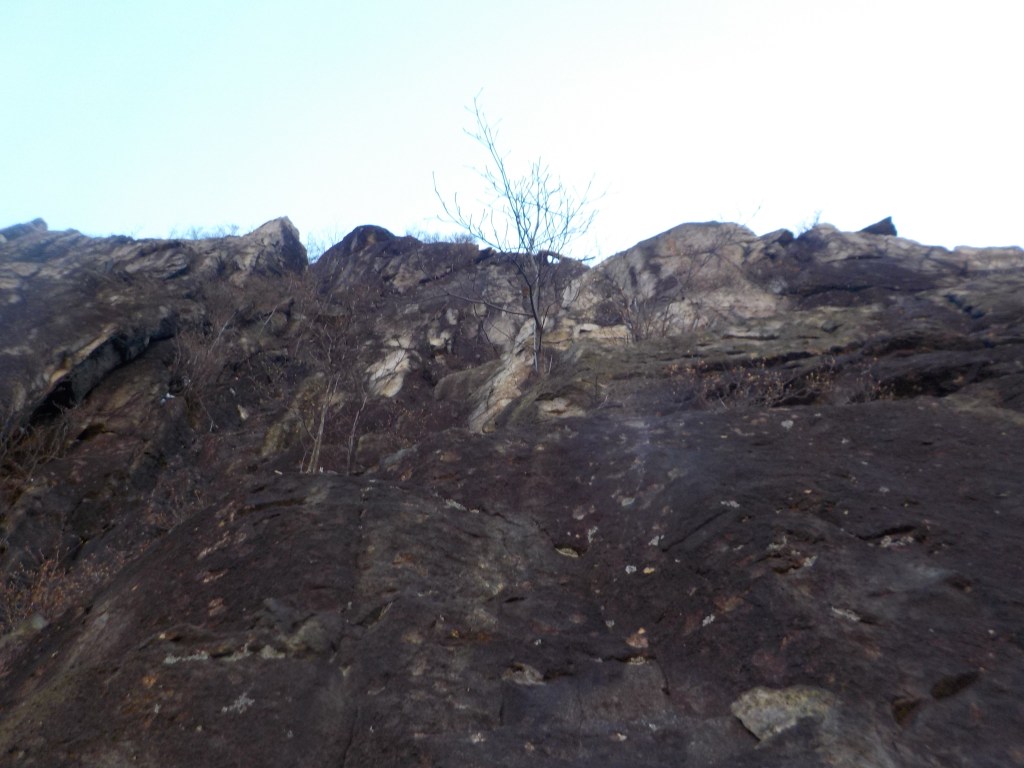 ・右上に見えている枯れ木を目指してフェースを右へ登っていきます。邪魔な枯れ木はくぐって通過しましたが他は特に問題なく登れました。(枯れ木は動いて危なかったのでフォローのOさんが撤去しました。)