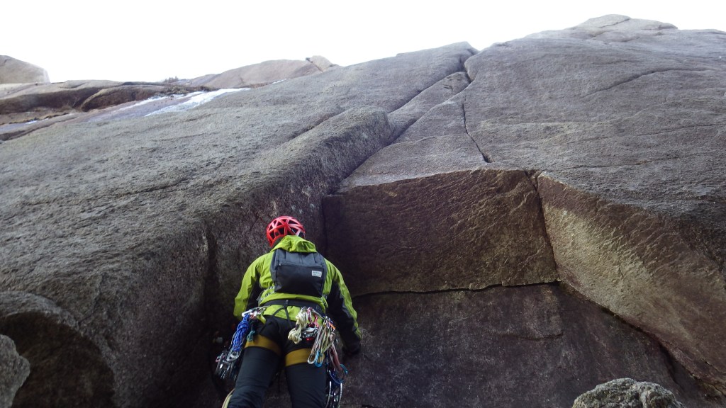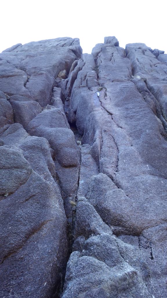 ・ワイドクラックで岩が滑らかでフッキングが決まりづらいので身体を使ったワイド登りで登りました。挟まれるので落ちませんがスタンスが無いところはアイゼンで立ち込めないので上へ上がりづらく難儀しました。とても登りづらかったです。