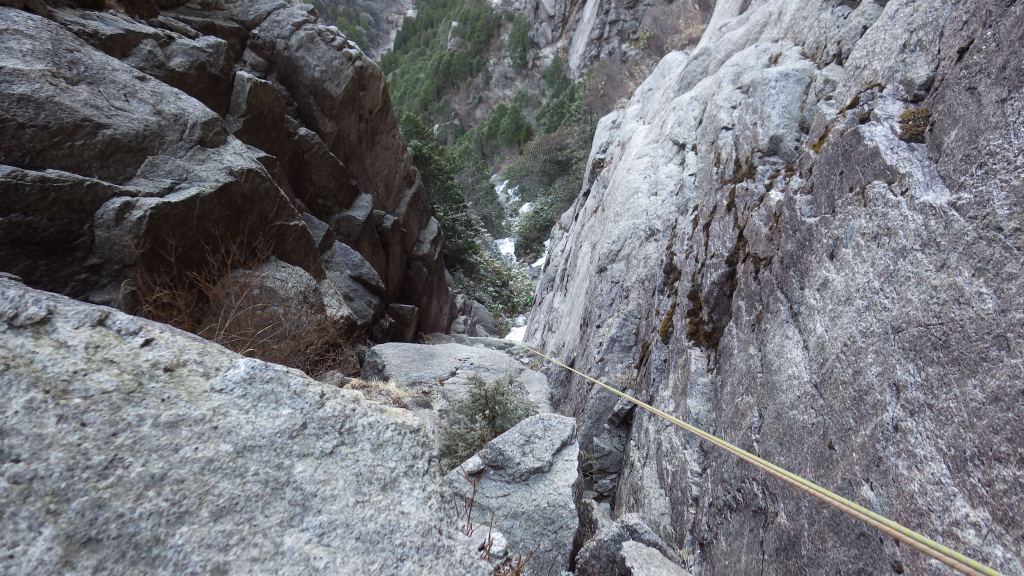 ・P3終了点からP2取付へは50mロープ2本で懸垂下降。