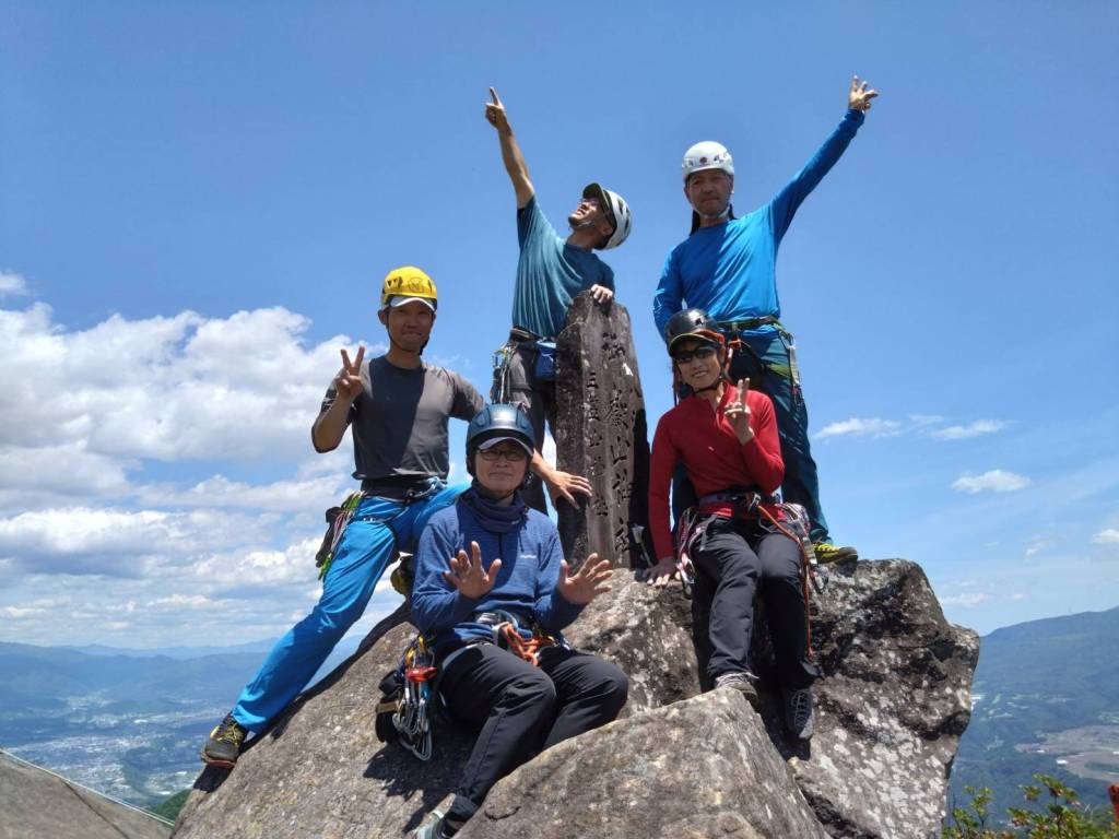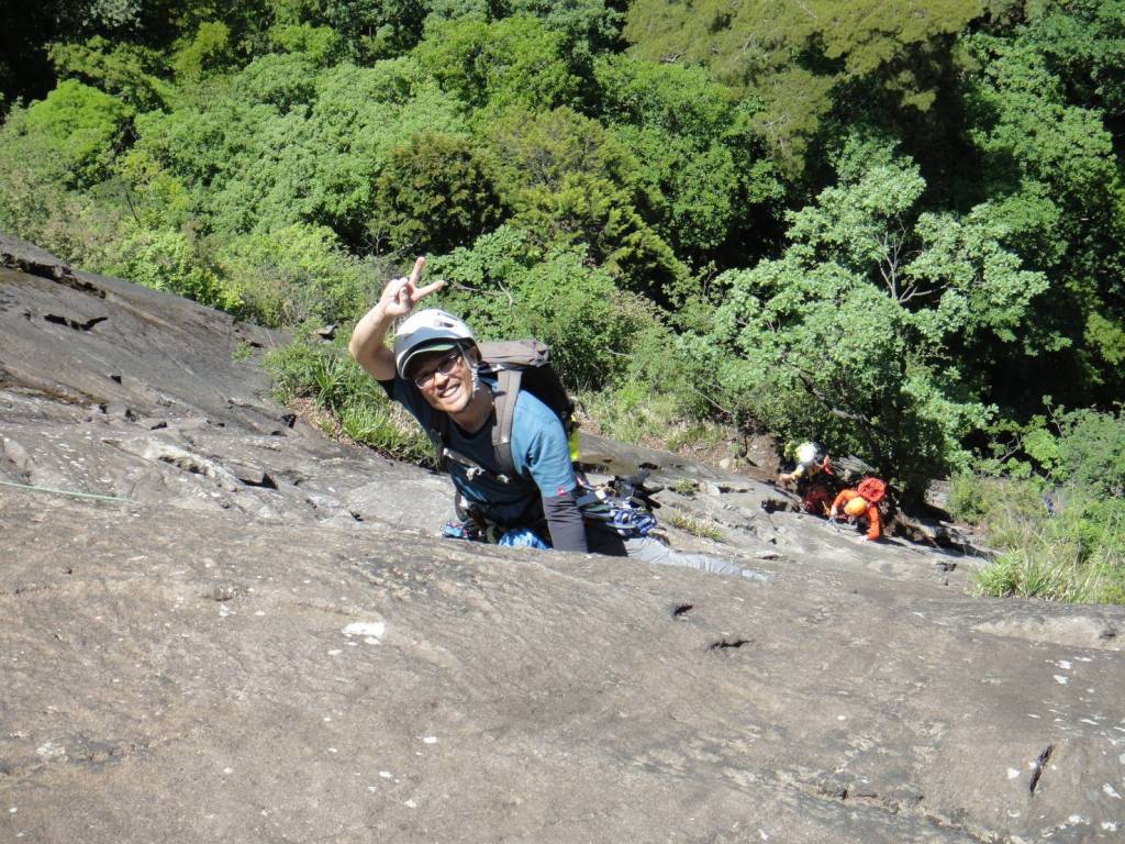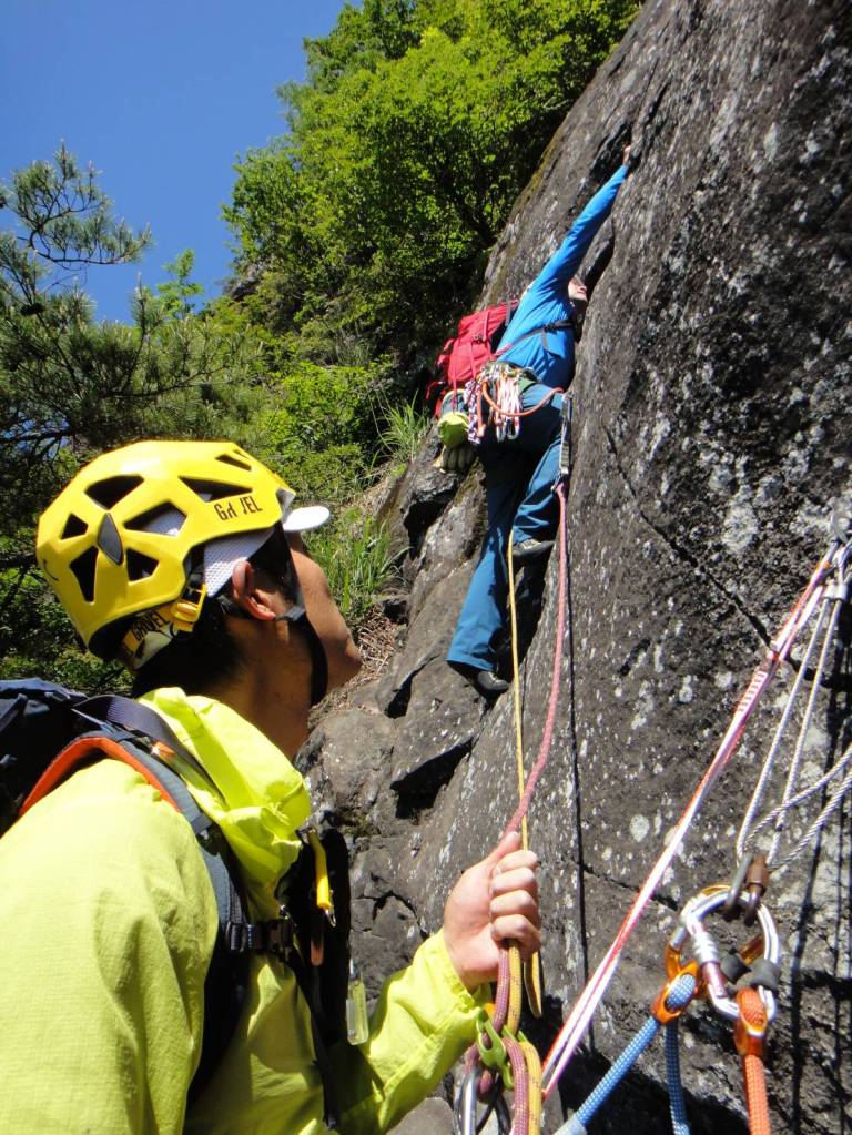 (渡辺さ)リードしていた2ピッチ目の途中で終了点を確認しようと上体を反らしすぎたようで足がスリップしてフォールしました。(足から)ザックを背負っての登攀の時は気をつけなければと反省しました。久しぶりに登って、とても楽しかったです!