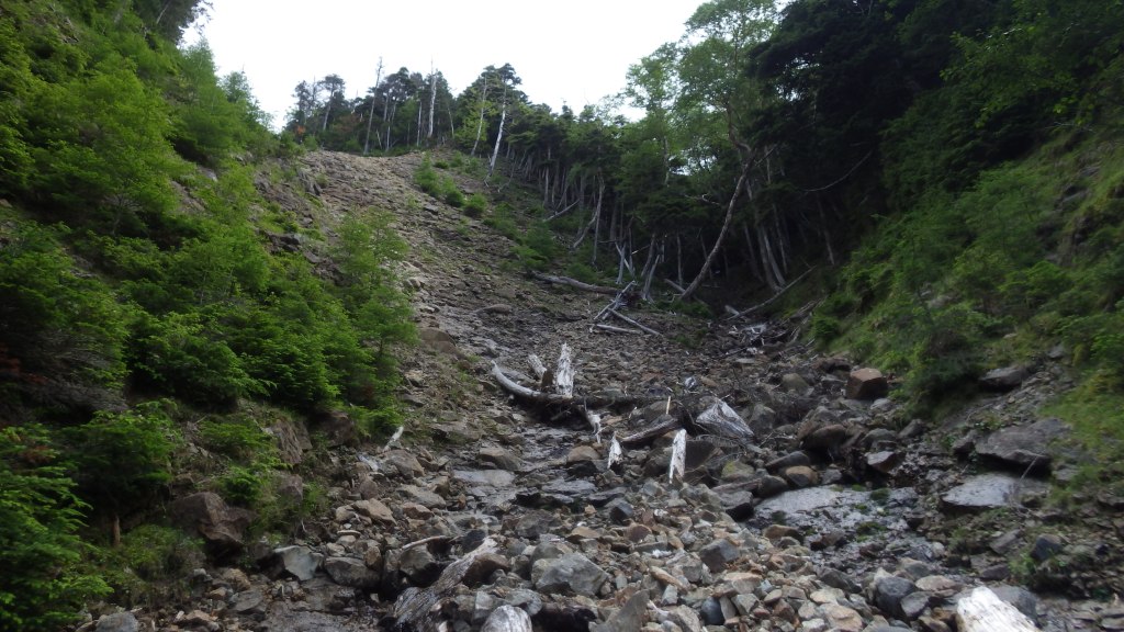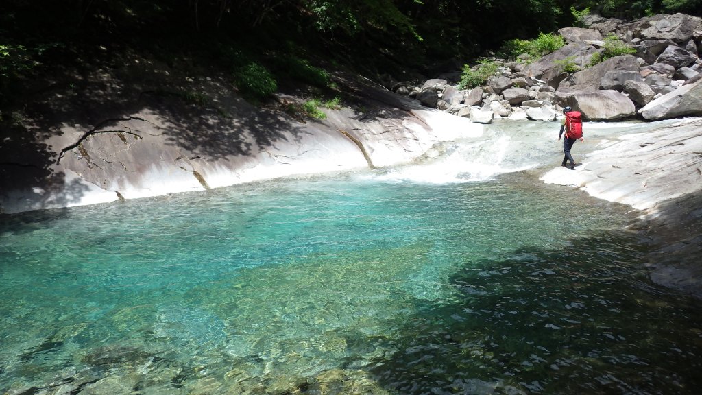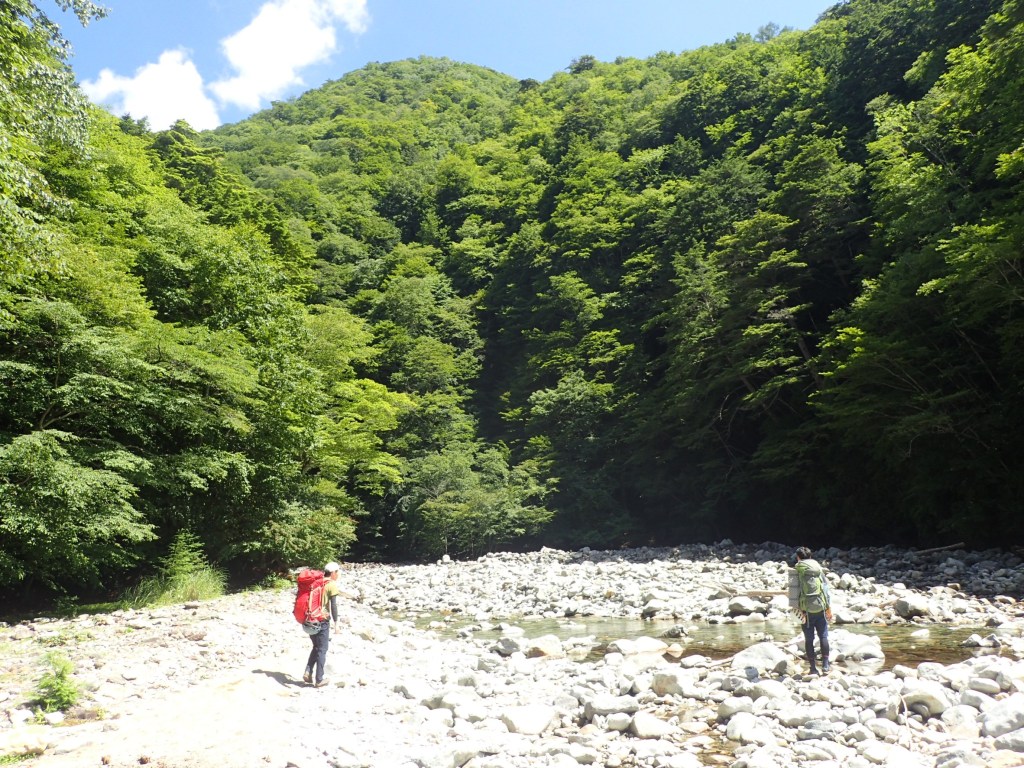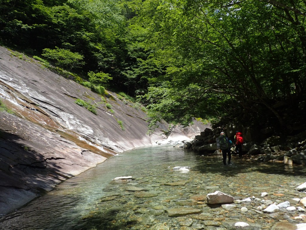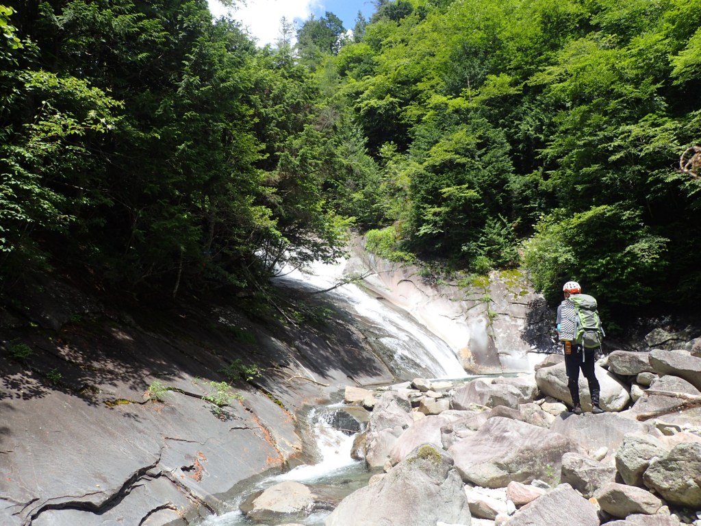 (山宮)7/16(日)~17(月)は山岳会山行で神蔵さん提案の笛吹川東沢釜ノ沢東俣から甲武信ヶ岳を登ってきました。3連休で剱岳のチンネ左稜線へ行く予定でしたが悪天予報と黒部ダムからのアプローチ問題もあり今回もチンネ左稜線は断念しました。(中止にしたのは何回目だろ?)他のアルパイン候補地も微妙な感じだったので1泊2日でのんびり沢登りに変更しました。沢の印象は山の神から両門の滝までは綺麗な沢を歩く感じで、そこから先は微妙な沢をだらだら歩く感じです。水師沢の次の二俣は正解の右ではなく左へ行ってしまった。(この二俣を釜ノ沢東俣と木賊沢の二俣だと思ったから)途中までは水線からそんなに外れずフリーで登って行ったがナメ3段の滝の最上段がフリーで登るには悪い感じがして『高巻き?』とも思ったが巻道も微妙な感じでもしかして?と思い神蔵さんにGPSで現在地を確認してもらったらルートから逸れていることに気付きました。間違った二俣のところまで下りるのも一苦労なので東へ東へとトラバース。良いところで30mロープを出して懸垂下降3回で釜ノ沢東俣の支沢まで下りれました。今回は間違った支沢に入り下降途中でロープを使うのでそこでハーネスを装着しましたが(沢慣れしている岸畑さん男はゴボウで下りると言ってハーネスを付けず、慎重派の神蔵さん女は駐車場からハーネスを付けてました。)ルートを間違わなければ自分1人ならハーネスやロープは必要ないと思いました。(念のため携行はしますが。)ビバークしたところは虫が少なく快適でした。また朝方は少し冷えましたが沢着にダウン上を着てシュラフカバー&シュラフシーツで快適に眠れました。