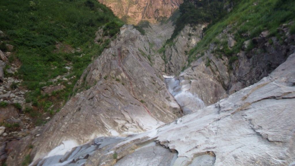 ・巻道終点にあるテールリッジ末端の沢床へ下りる懸垂下降用の残置支点はしっかりしていました。懸垂下降で沢床の1段上まで下りてロープを片付け、そこからクライムダウンして沢床に下り足早にテールリッジ末端へ移動。(雪渓はいつ崩壊するか分からないので。)