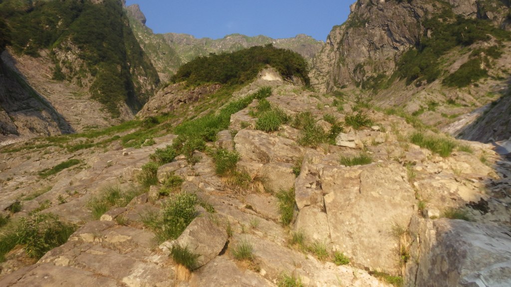 ・一ノ倉沢出合からテールリッジ末端までの雪渓はもう無いので巻道を利用してアプローチします。(雪渓は衝立前沢の出合に一部とテールリッジ末端から左横の上部にありますがいつ崩壊するのかは分かりません。)