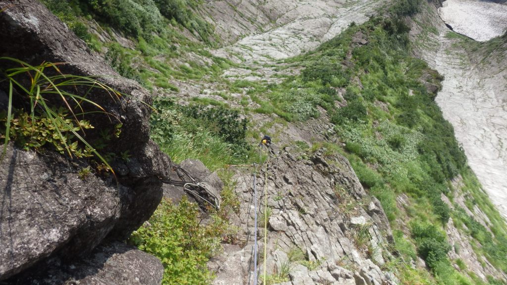 ・衝立の頭から50mロープ1本で6回懸垂下降してトポ5P終了点から50mロープ2本で4回懸垂下降し中央稜取付まで下りました。(懸垂下降計10回)