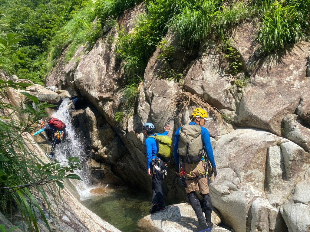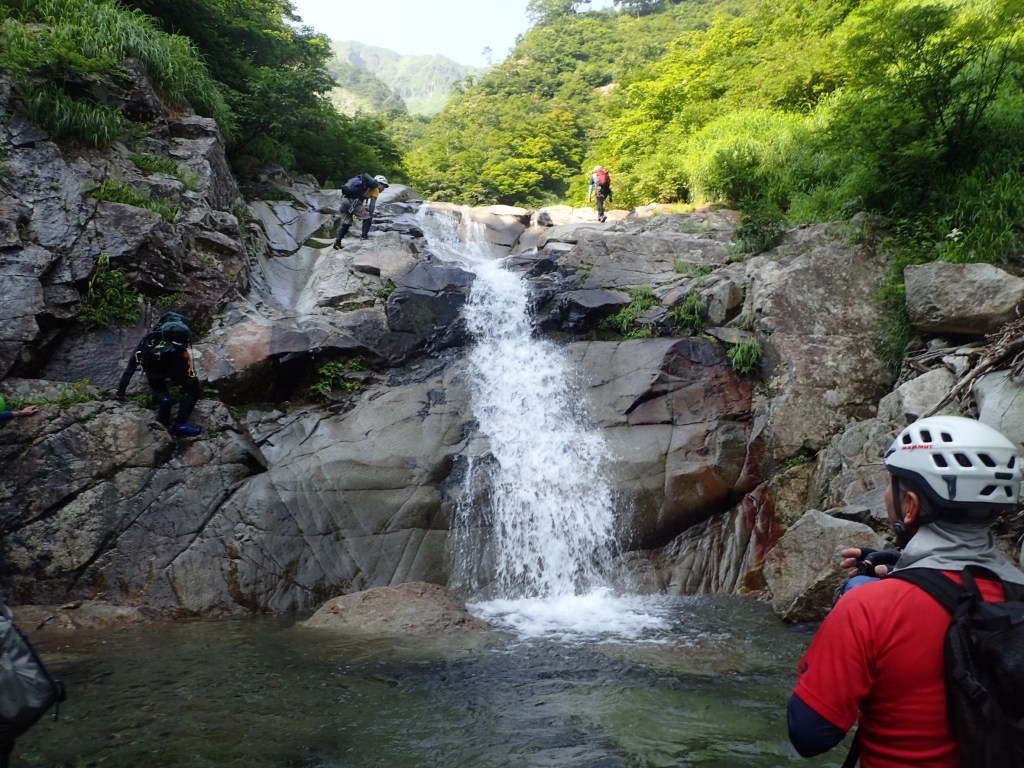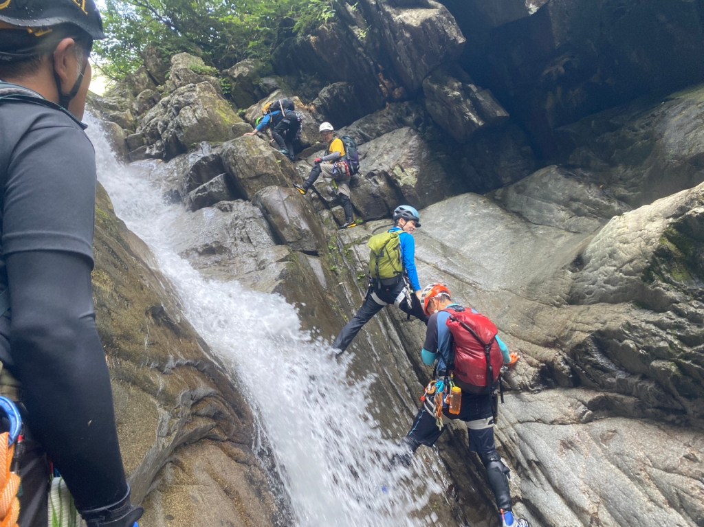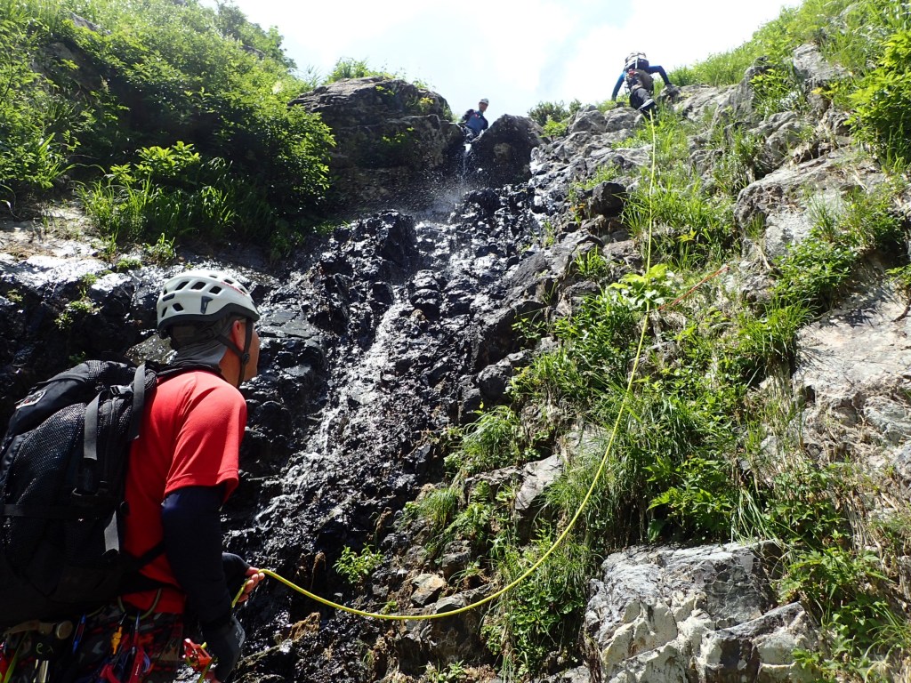 ・右俣に入ってから3つ目の7m滝でロープを出しました。(荒木が初リードにチャレンジ。滝上での終了点構築確認のため山宮が最初にフリーで登る。)