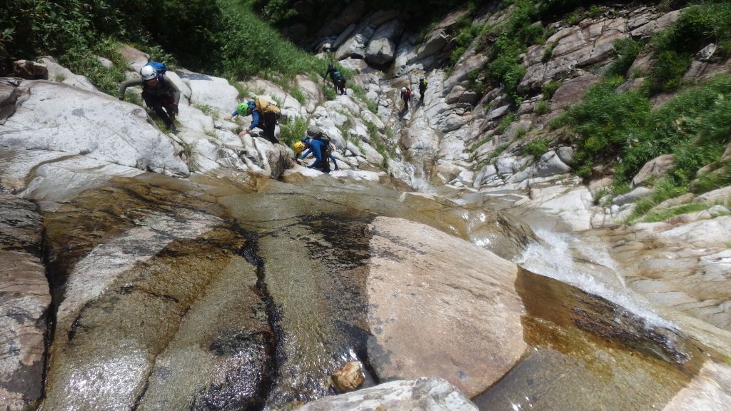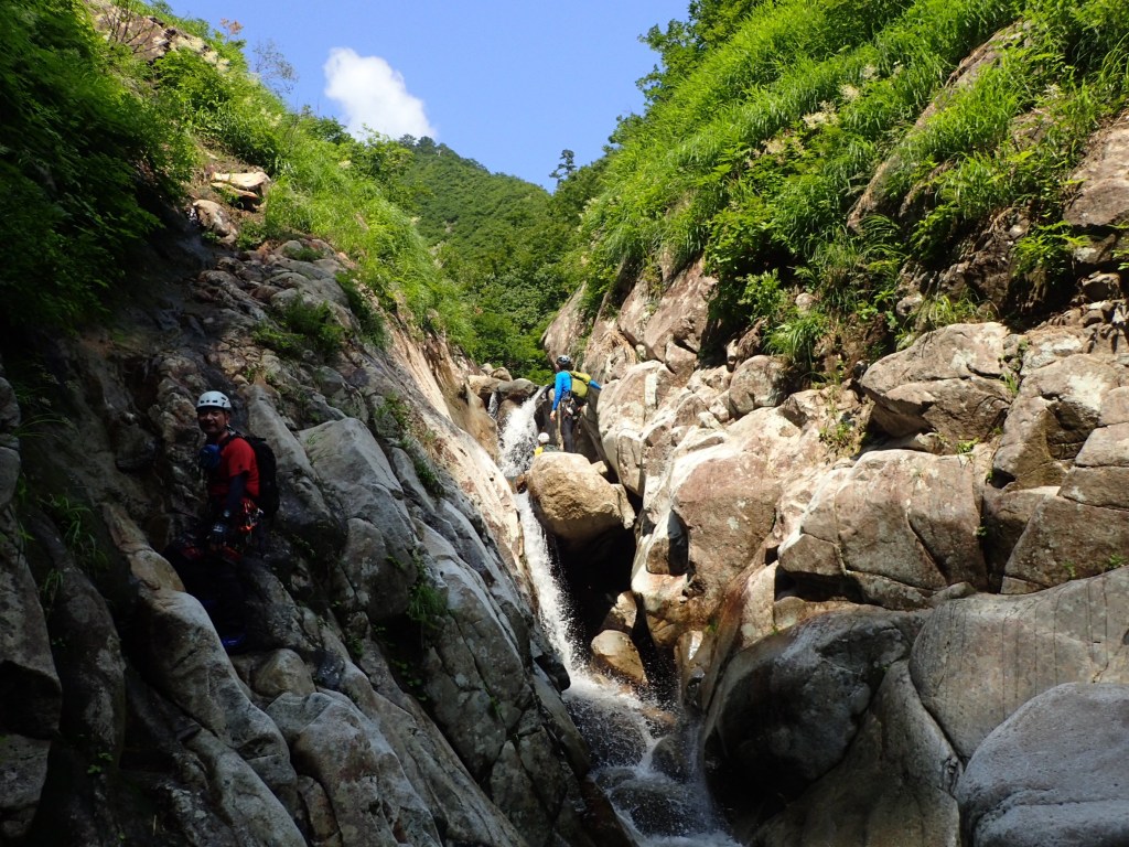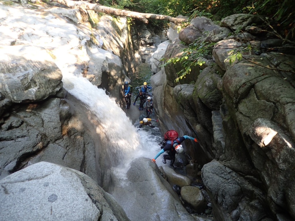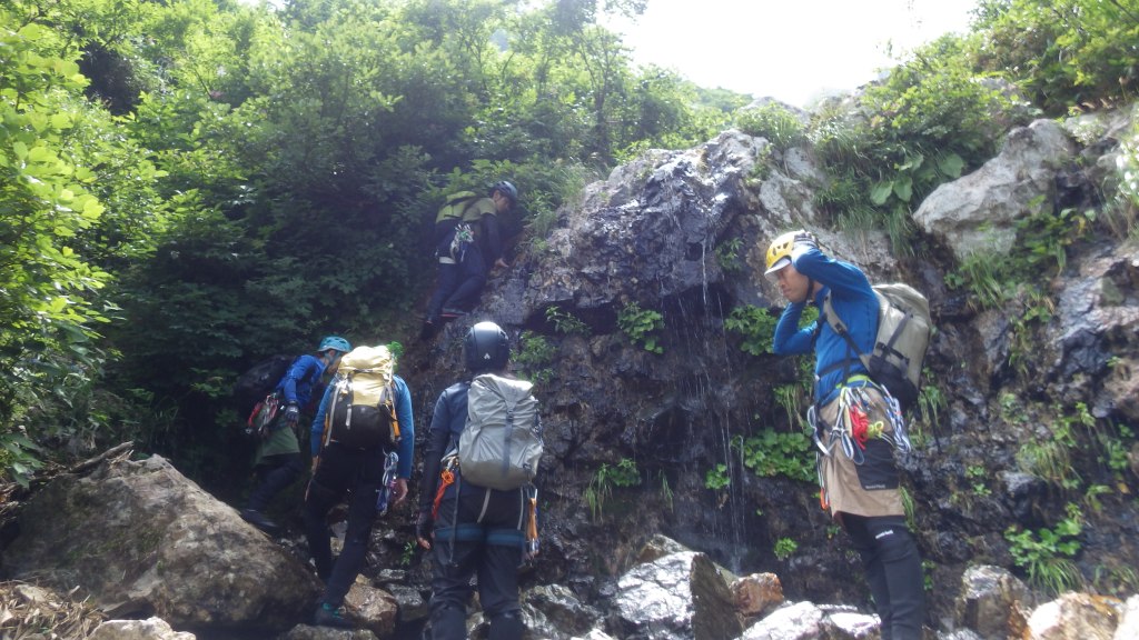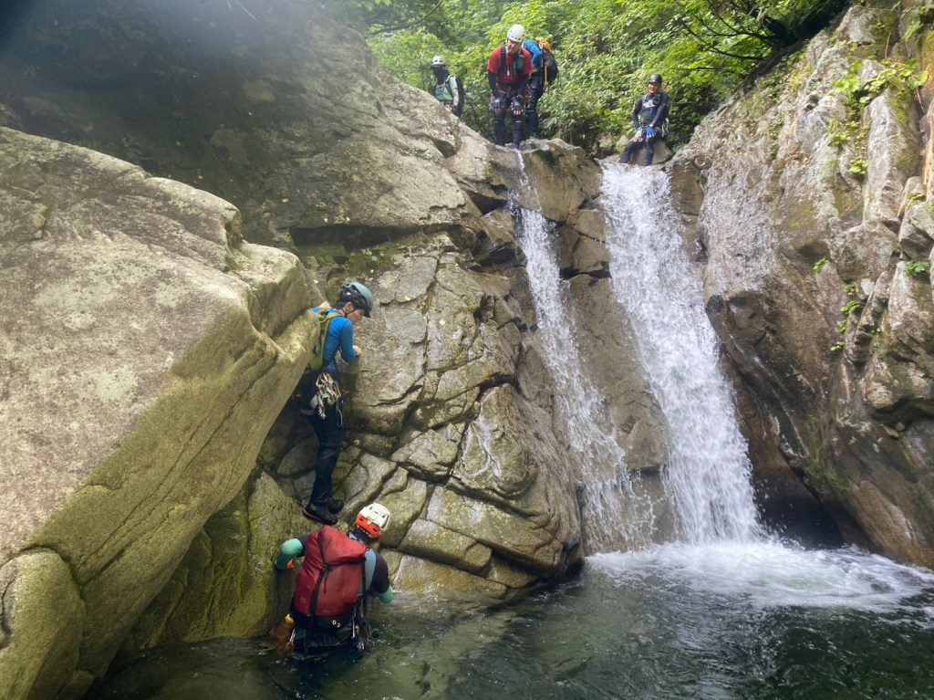 ・右俣に入ってから3つ目の7m滝でロープを出しました。(荒木が初リードにチャレンジ。滝上での終了点構築確認のため山宮が最初にフリーで登る。)