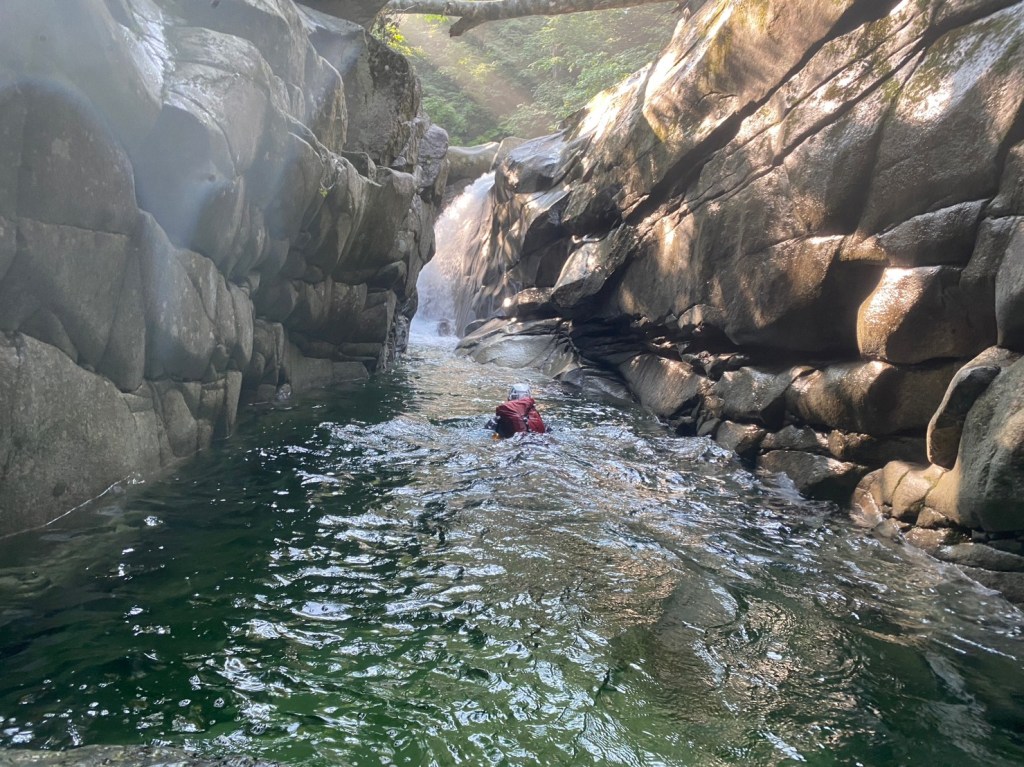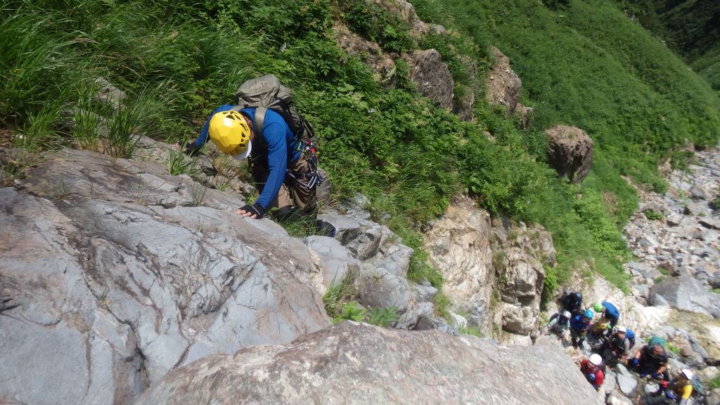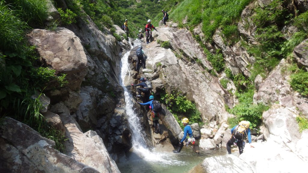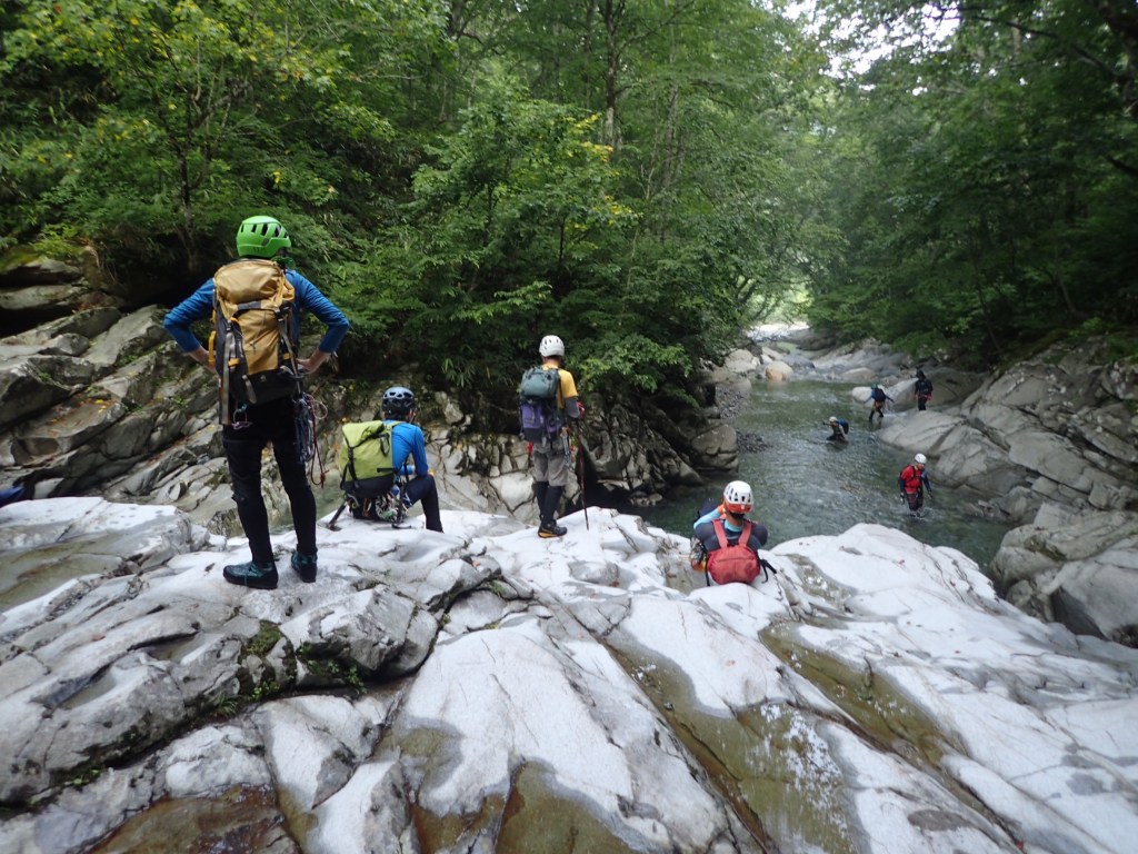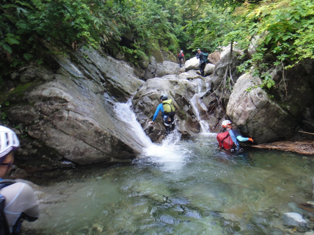 (神蔵)参加者11名と大所帯でしたが泳ぎたい人は泳ぎ、滝を登りたい人は登り、巻きたい人は巻き、とそれぞれ自分の技量や好みに合わせて楽しめる良い沢でした。行程も短過ぎず長過ぎず会山行の日帰り沢にピッタリ!計画ありがとうございました。大勢で行く山行はベテラン頼みでただ後をついて行くだけのガイド登山みたいになってしまいがちですが、どんな時も現在地と予定のルートくらいは確認しながら進むようにしたいと思います。滝登攀のラインの見極めや沢のルーファイはなかなか難しいですが少しずつでも感覚を養って行きたいです。
