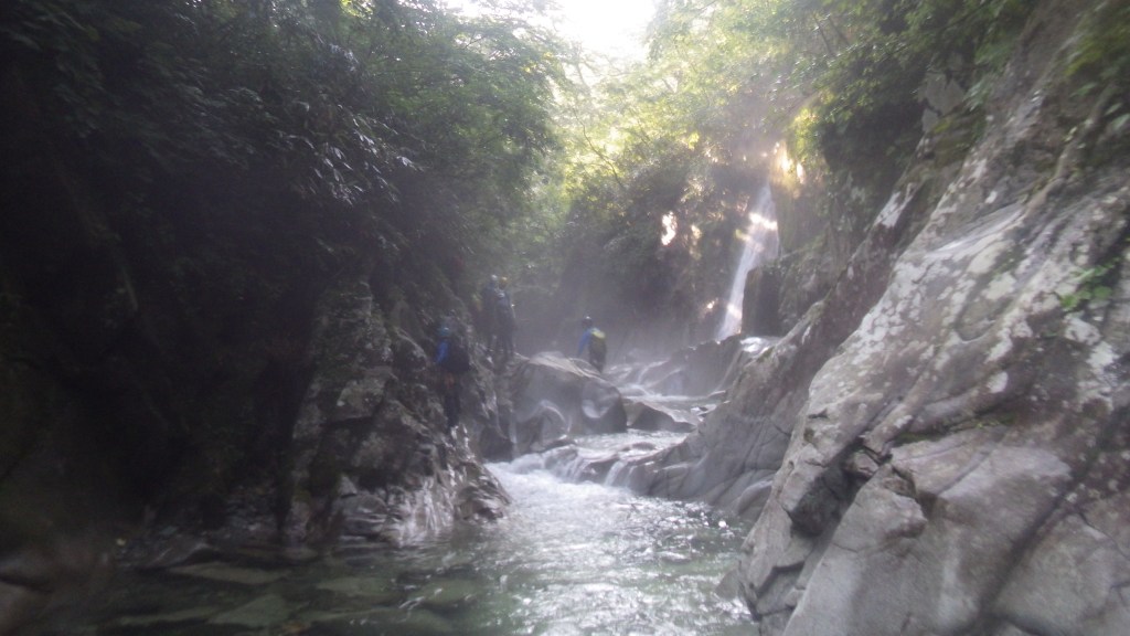 (銅谷)3年前の敗退から行ってみたいと思いつつ…難しい沢だと思ってなかなか行く事が出来なかったです。なるべく巻かずに行ける所は行ってみようと思いオキドウキョも挑戦組に入ってみて良かったです。以前はいつも最後尾で皆さんを待たせてばかりだったけど今回は真ん中位で行動を取る事が出来て自分でも少しは成長したのかな?と嬉しくなりました。天気も良く沢日和でとても楽しい1日でした。