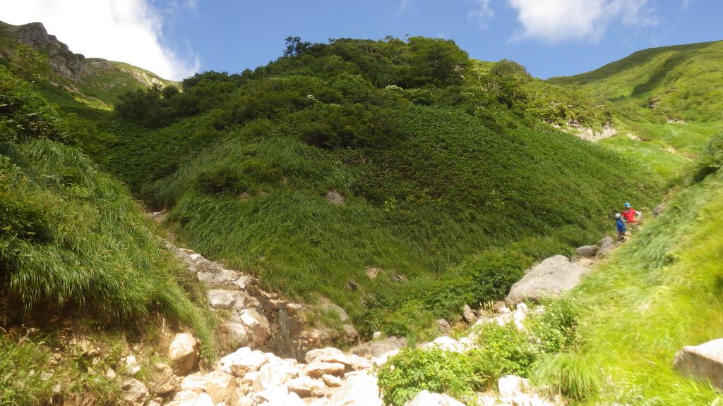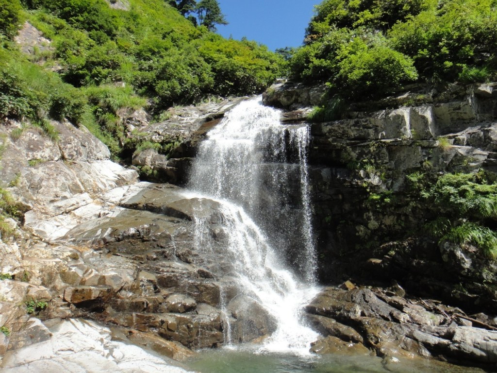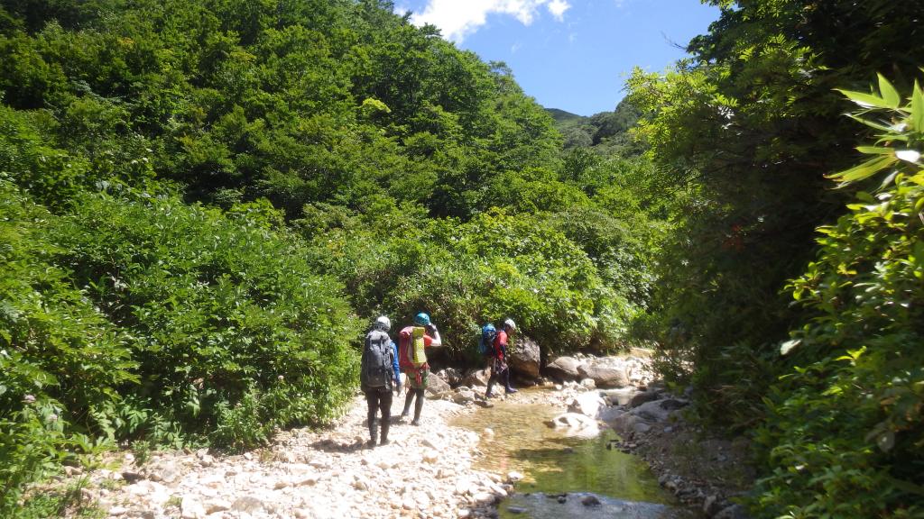 (進藤み)スタートから入渓までの2時間30分のアプローチと2段40m大滝以降のゴーロ歩きと永遠に続く小滝の連続に少しウンザリしました。朝日岳から白毛門登山口までの約4時間の下山。ヘトヘトでした。タープのみでの泊まりは虫も居なく思っていたより快適でした。この感想をみて分かる通り沢での印象が薄く、この前の井戸小屋沢の方が綺麗だった様な気がします。沢のグレード自体は難しくないと思うので私達が整地した三ツ星ホテルに泊まりに行ってみてください(笑)あとヒヤリ・ハットですが滑った滝のバンドを横断中で立ち上がるときザックが壁にあたり跳ね返され危うく落ちるところでした。小さいミスが命取りとなるので皆さんも十分注意してください。